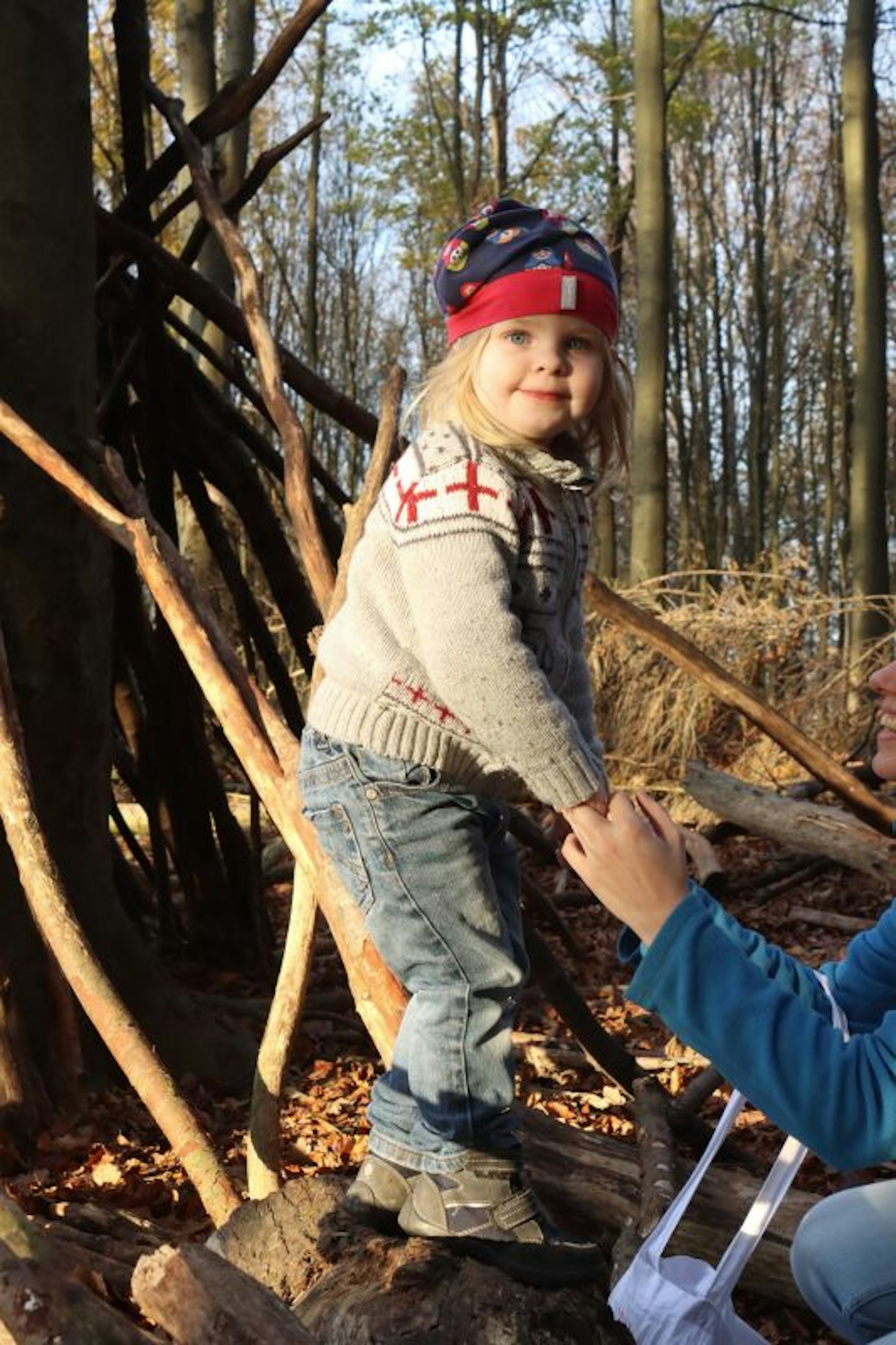Auch auf dem Waldspielplatz tummelten sich die Kinder begeistert. Die zweijährige Lisa balancierte an der Hand ihrer Mutter über einen Baumstamm, während ihr Bruder das Innere des Holzzeltes untersuchte, dass die anderen johlend umkreisen.