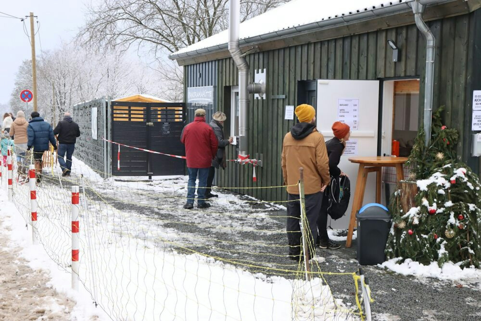 Nicht nur die Hänge, sondern auch die Wanderwege rund um das Blockhaus waren gut besucht. Zahlreiche Besucher genossen einen Spaziergang durch die verschneite Wacholderheide oder machten eine größere Runde bis nach Belmicke. Zur Stärkung gab es warme Getränke, eine Waffel oder Bratwurst an der Panoramahütte. Betreiber Bernhard Junge hatte extra für eine Einbahnstraße vor der Speisenausgabe gesorgt, damit sich die Gäste nicht zu nahe kommen, und die Toiletten sind ebenfalls dicht. „Die meisten fragen nach Glühwein“, erzählt er. „Aber Alkohol gibt es bei uns momentan nicht.“