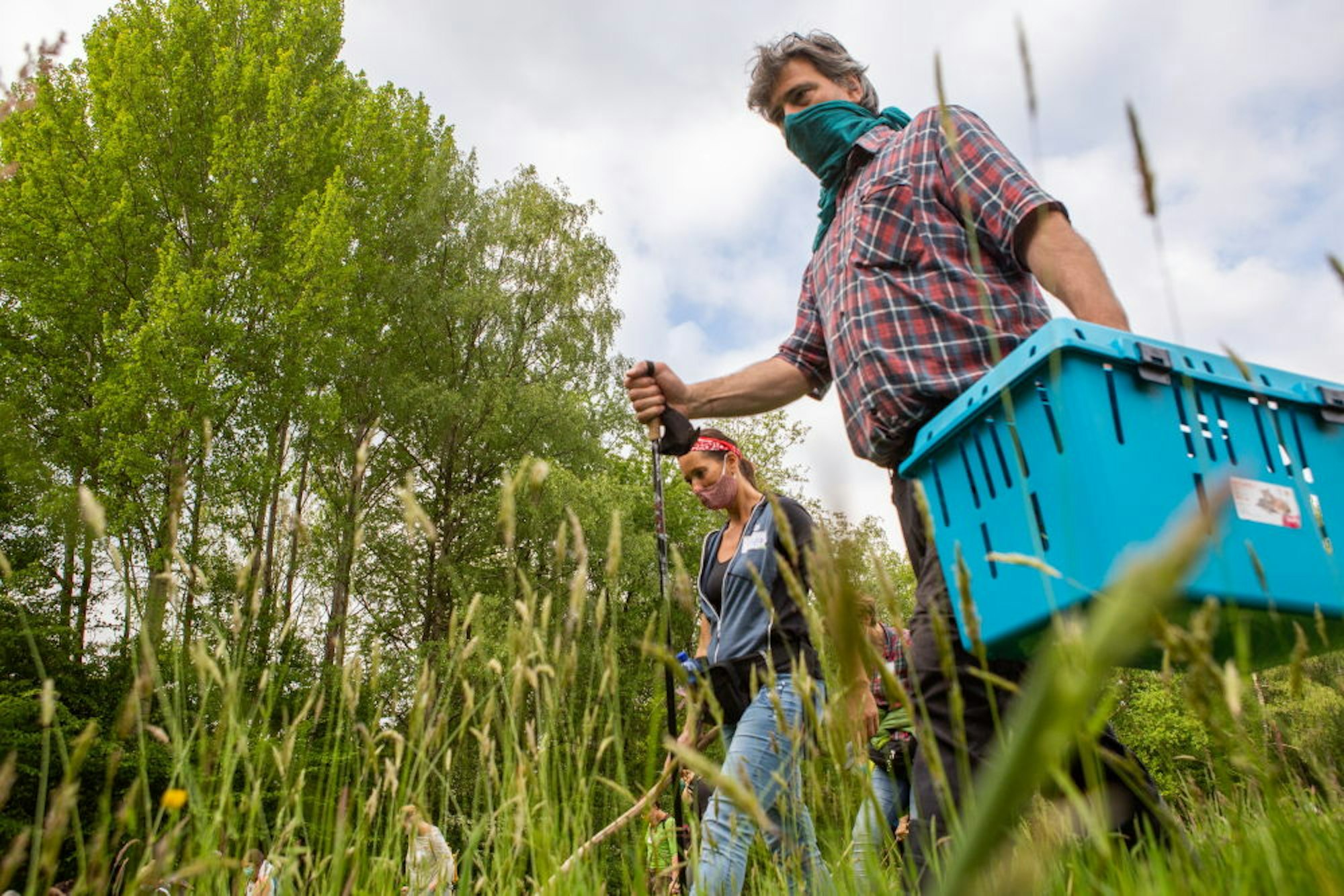 In aller Früh gehen 15 Tierfreunde ein Jagdrevier ab, die Augen immer auf das hohe Gras gerichtet.