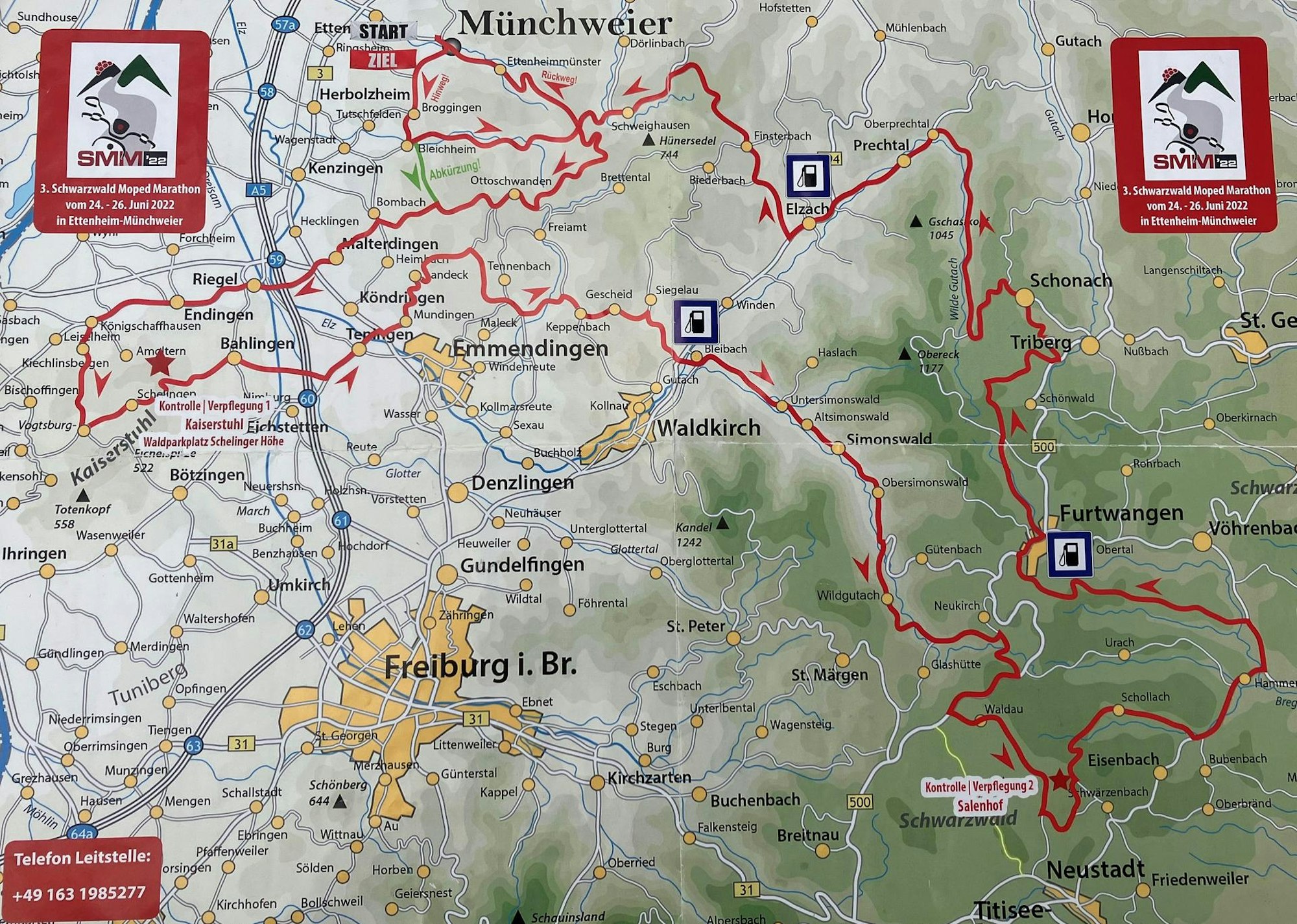 Der Marathon führte schließlich 230 Kilometer durch den Schwarzwald mit dem einfachen Ziel, am Endpunkt der Strecke anzukommen. Markiert wurde der Weg durch große Pfeile auf der Straße. An zwei Zwischenstopps konnte sich gestärkt werden. Neun Stunden waren Schabon, Koch und Haas insgesamt unterwegs. Davon saßen sie fünf Stunden und 30 Minuten auf ihren Simsons mit einer Durchschnittsgeschwindigkeit von 41 Stundenkilometer. „Die Kulisse der Strecke war toll. Wir sind an vielen Schwarzwaldhäusern vorbeigefahren und am Kaiserstuhl“, erzählt Michael Koch. Am Wegesrand feuerten Zuschauer die Fahrer an.