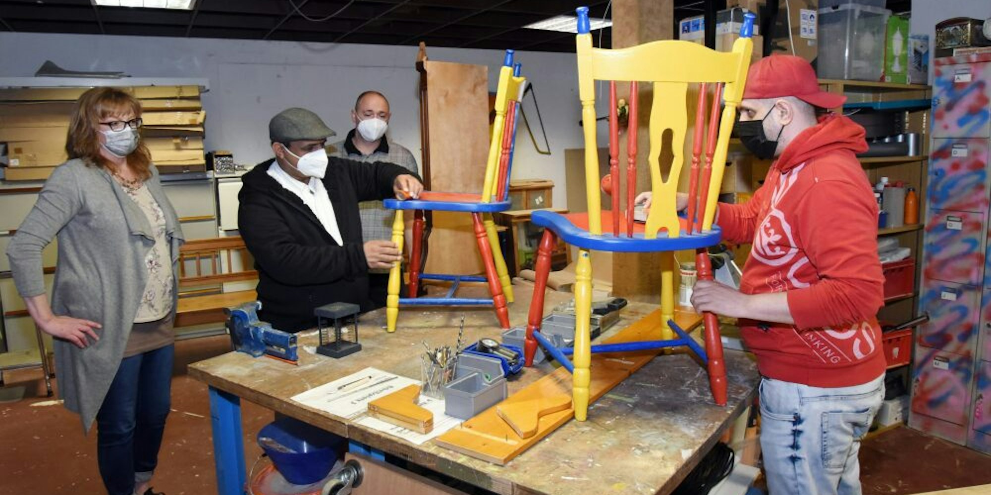 Weil keine Kundschaft ins Geschäft darf, haben die Mitarbeiter und acht AGH-Kräfte mehr Zeit als sonst, und sie haben kreative Ideen entwickelt, sie zu nutzen, indem sie nicht nur gebrauchte Möbel restaurieren, sondern ihnen auch noch ein angesagtes Upcycling verpassen. So haben sie zum Beispiel aus zwei Stühlen und einem Brett fürs Urlaubsfeeling zu Hause eine kunterbunte „Mallorcabank“ gebaut, mit Ablage für Cocktails. Ein schlichter Bilderrahmen strahlt im edlen Gold mit integriertem Kerzenleuchter, und auf die Schubladen einer Kommode kann dank einer Spezialfolie im Schultafel-Look mit Kreide drauf geschrieben werden, was drin ist.