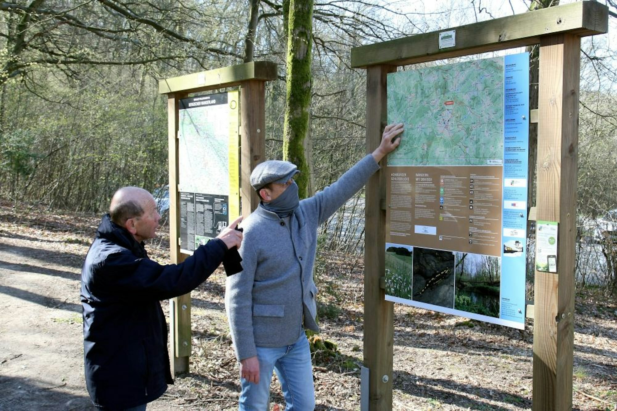 „Was außer Wandern soll man auch sonst tun, wenn alles geschlossen ist?“, sagt Lars Hoffmann (52), der mit seinem Vater Uwe (80) die Schuhe geschnürt hat. Die Lindlarer haben ihr Auto am Morgen in Marienberghausen geparkt und sich dann auf die Golddörferroute begeben.