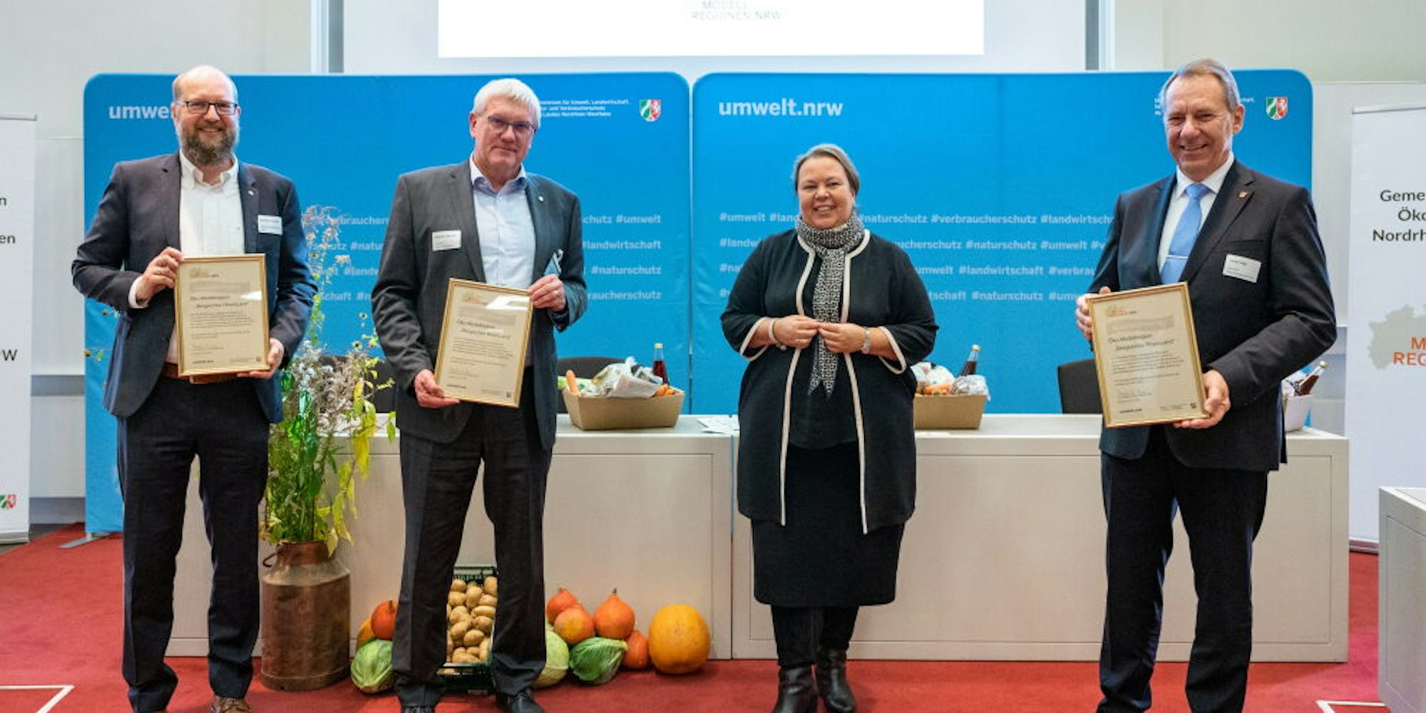 Im Auditorium des Umweltministeriums übergab Heinen-Esser die entsprechenden Urkunden, verbunden mit der Zusage, dass die neuen Modellregionen einen jährlichen Zuschuss in Höhe von maximal 80.000 Euro abrufen können. Die Ministerin: „Wir wollen die Regionen dabei unterstützen, die Nachfrage nach Öko-Produkten aus ihrer Region anzukurbeln." Überdies unterstützt das Land die beteiligten Kreise dabei, ein Öko-Regionalmanagement zu installieren.