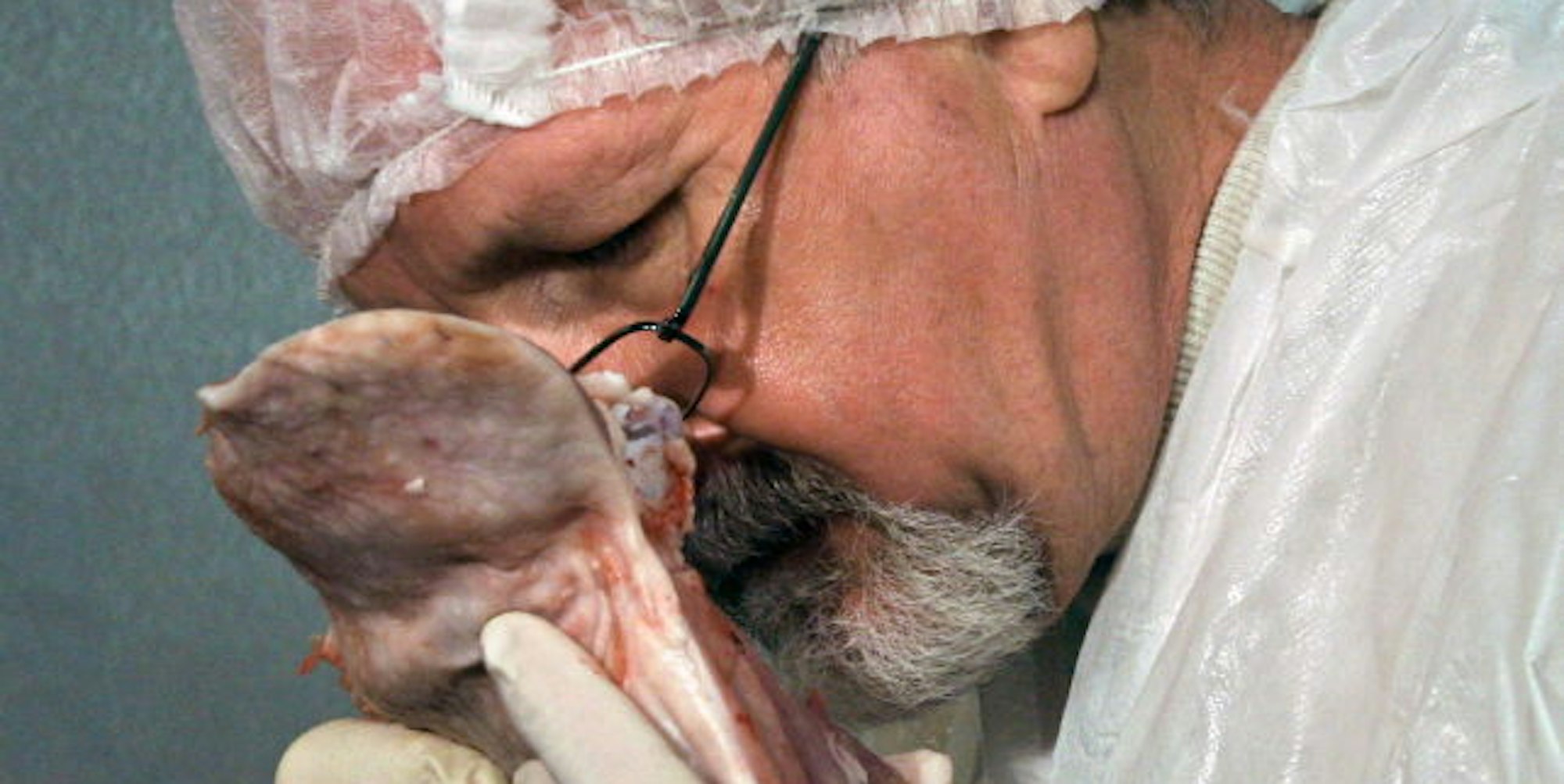 Ein Lebensmittelkontrolleur riecht an einem Stück Fleisch. Mit der Zahl seiner Überprüfungen im vergangenen Jahr hinkt der Oberbergische Kreis wegen Personalknappheit deutlich hinterher.