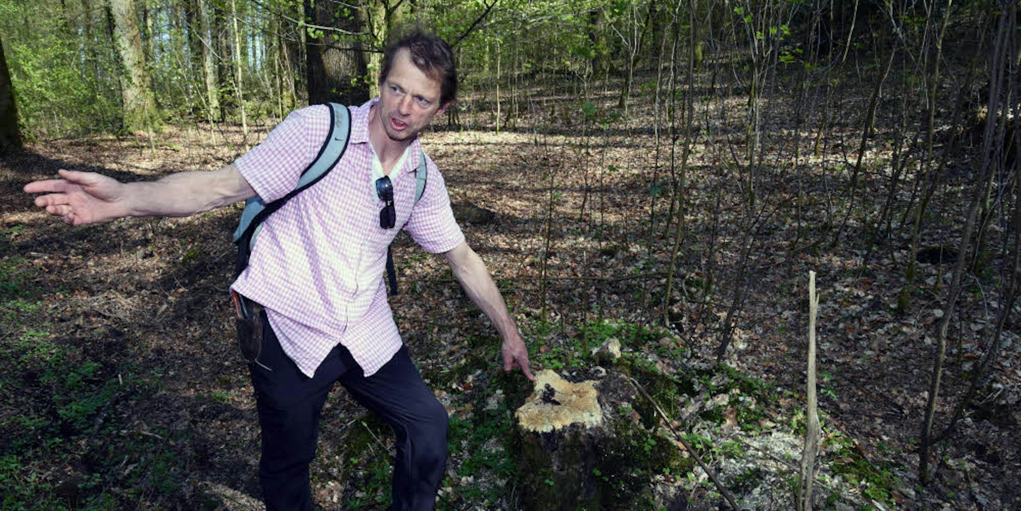 So wappnet sich ein Baum gegen Pilze: Wanderführer Harald Hamel zeigt im Wald unterhalb von Schloss Homburg, wie Bäume leben und wachsen.