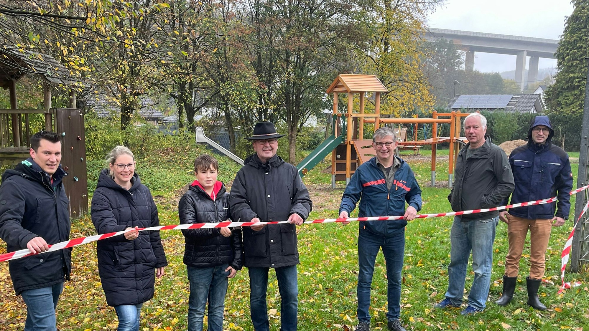 Zur Einweihung des neuen Spielplatzes wurde von den Protagonisten symbolisch ein rot-weißes Band durchtrennt.