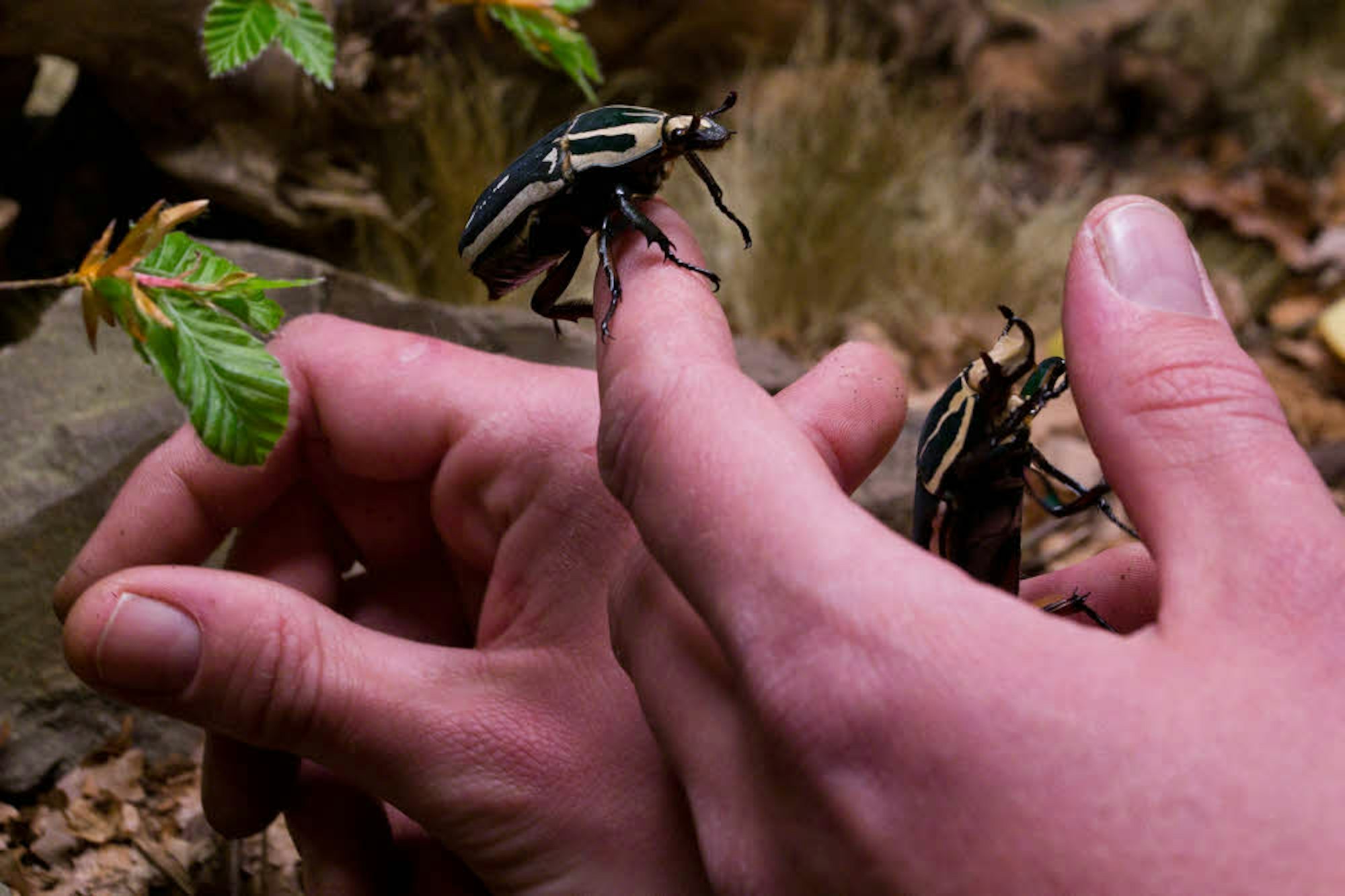 Der 33-jährige gebürtige Gummersbacher gehört erst seit einem Monat zum festen Stab des Affen- und Vogelparks, hat dort aber bereits vor gut einem Jahr als Gehegeplaner positiv auf sich aufmerksam gemacht. Das Terrarium, in dem die Rosenkäfer in ihren verschiedenen Entwicklungsstadien vom Ei bis zum Imago beobachtet werden können, war übrigens Teil von Dominik Frankes Diplomarbeit als Zoo-Designer mit Faible für Insekten, Spinnen und Reptilien. Sein Konzept für die Zooschule richtet sich an Kinder- und Jugendliche aller Schulformen, Tageseinrichtungen sowie auch Vereine und Gruppen.