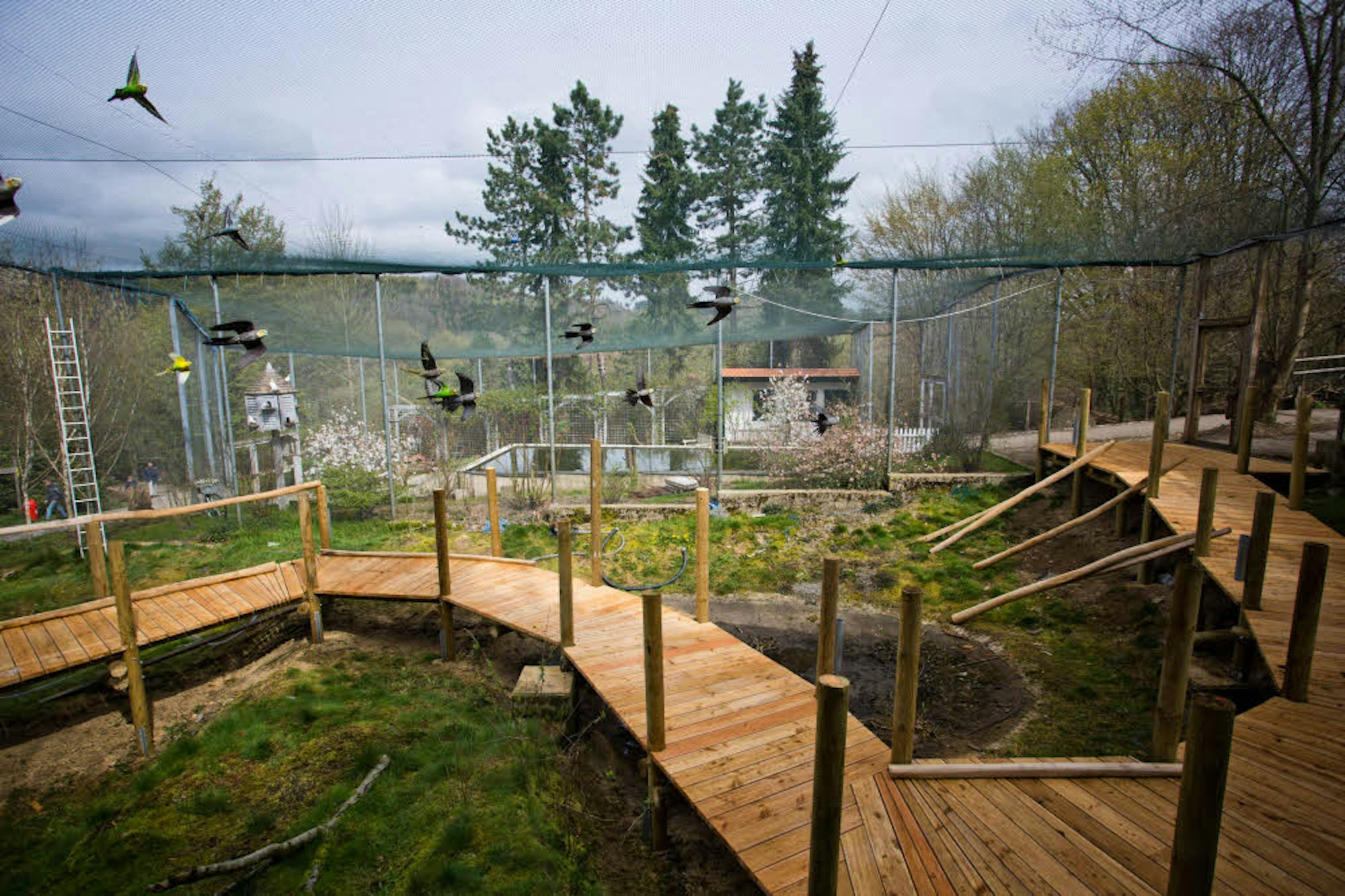 Für einen Privatzoo, wie es der Affen- und Vogelpark ist, gilt das Frühjahr in der Regel als die arbeitsintensivste Zeit im Zyklus der Jahreszeiten. Vor dem erwarteten Ansturm über die Ostertage wird überall im Park noch gehämmert, gebohrt und gespannt. Gerade ist das neue Netz über die Sittich-Freifluganlage fertiggestellt, sehr zur Freude der exotischen Flug- und Sangeskünstler, die ihre wiedererlangte Bewegungsfreiheit mit atemberaubenden Flugmanövern feiern. „Hier wird deutlich“, sagt Schmidt und schmunzelt, „dass Sittiche Schwarmvögel sind und nicht mit ein oder zwei Artgenossen im Käfig gehalten werden sollten“.
