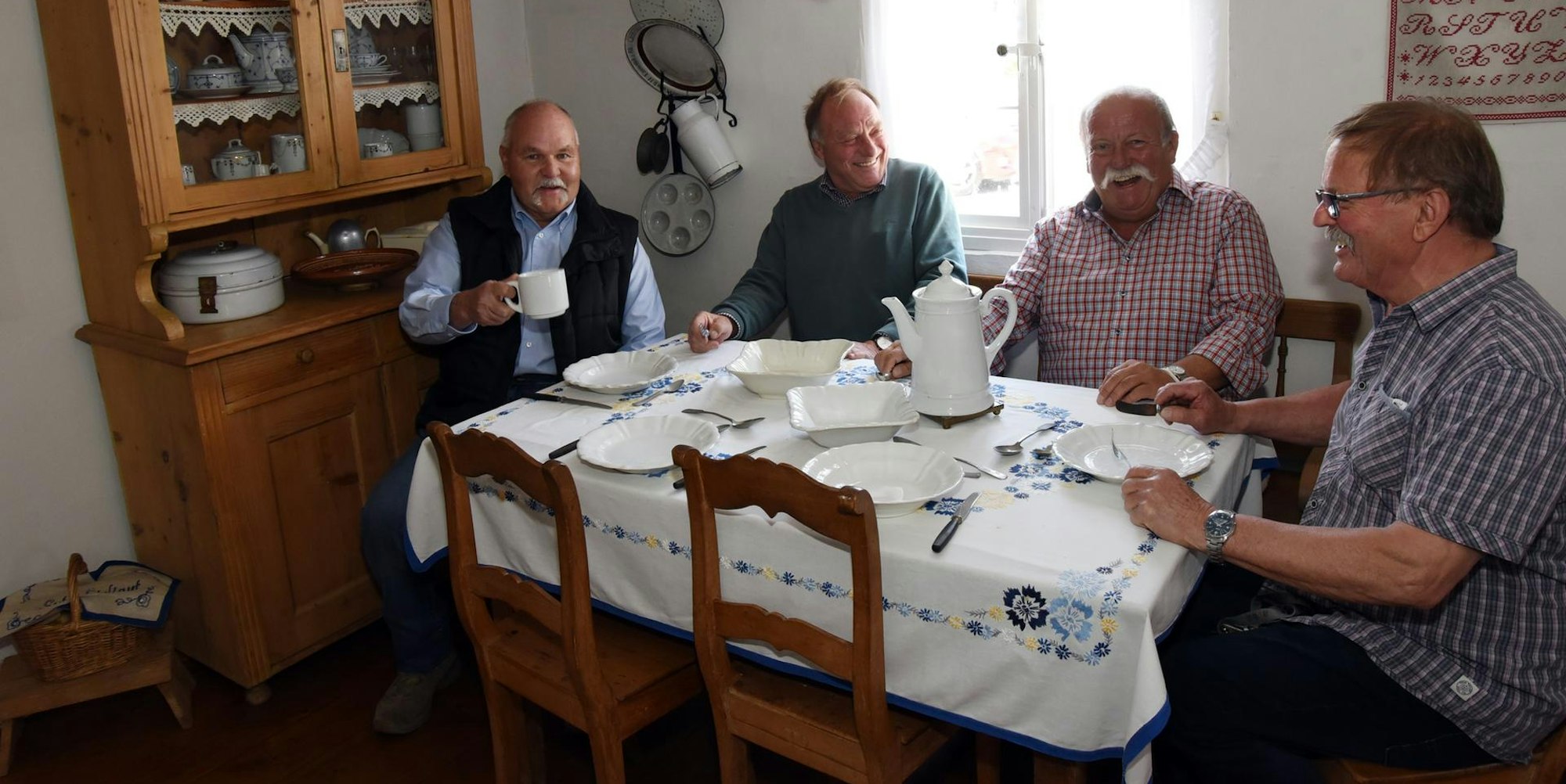 Noch sind die Kuchenteller leer: Die Heimatvereinsvorstandsmitglieder (v.l.) Werner Valperz, Thomas Roos, Günter Marx und Heinz Jaeger sind ansonsten bereit für den Neustart des Museums.