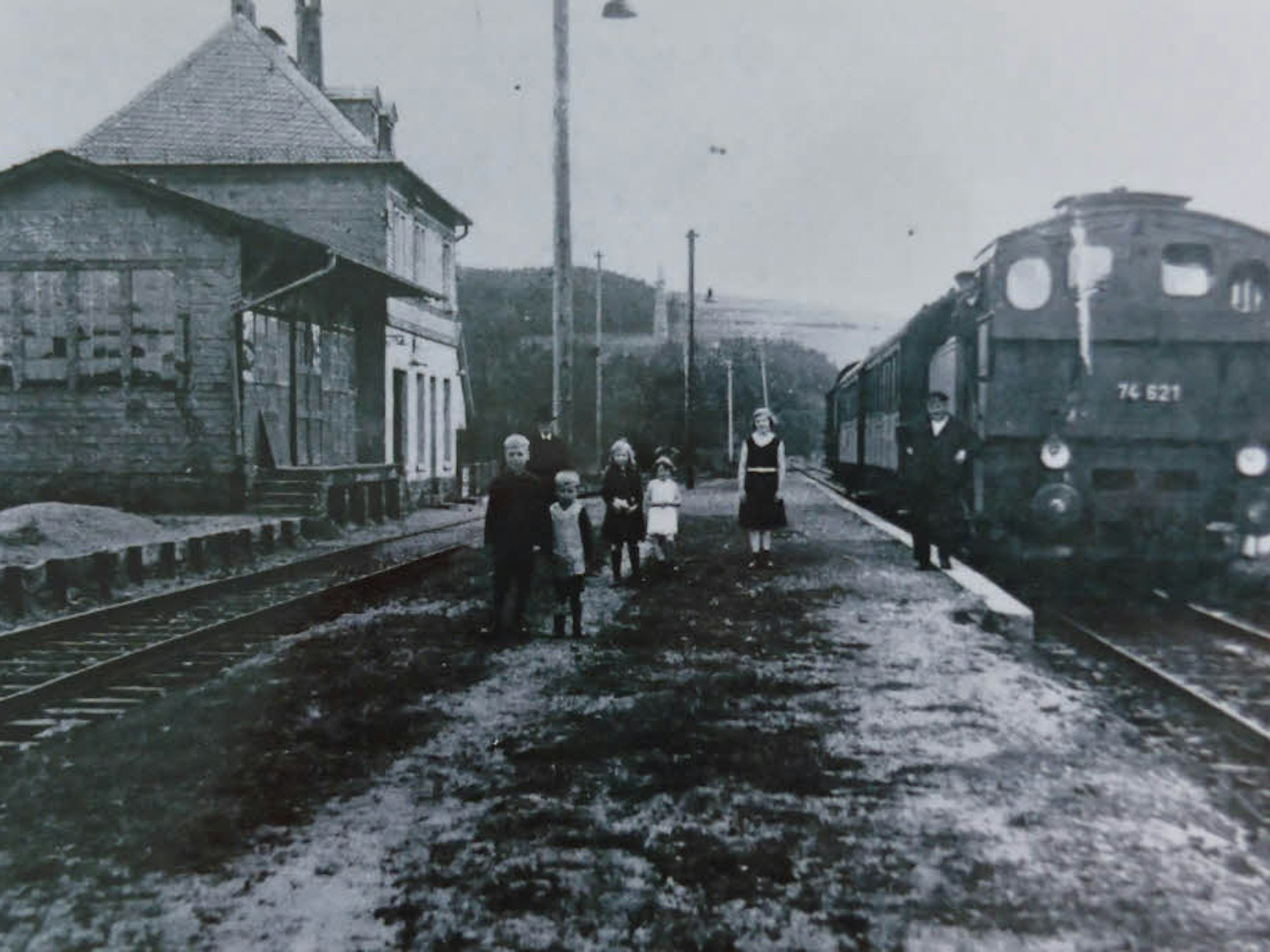Noch intakt, aber nicht offen zugänglich ist der Bahnübergang bei Niederodenspiel (l.) am Ufer der Wiehltalsperre. 1929 entstand die Aufnahme am Bahnhof Wildbergerhütte, sie ist eine der wenigen Dokumente vom Zugverkehr auf der Strecke.