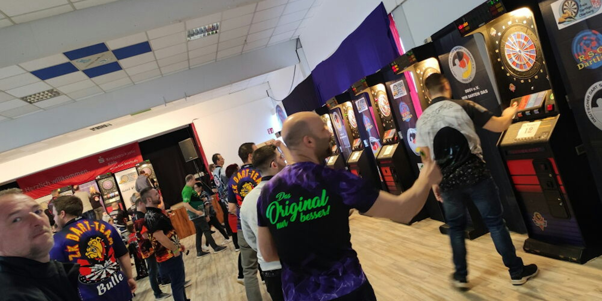 Zuletzt hatte die Meisterschaft 2019 im Heckershäuschen in Nümbrecht stattgefunden. Organisator Hermann Huth von der Dartsportgemeinschaft Rhein-Sieg-Oberberg (RSO) ließ sich aber beim Anblick der größeren Location gleich anstecken. „Ich habe einen Blick hineingeworfen und Marcos Idee sofort für gut befunden“, sagt der 57-Jährige. Gemeinsam sorgten Huth und Dammeyer für einen reibungslosen Turnierablauf und verwandelten die Halle mit insgesamt 19 Dartsautomaten zu einem kleinen „Ally Pally“, wie der berühmte Alexandra Palace in London genannt wird, in dem jährlich die Darts-Weltmeisterschaft tausende Fans anlockt.