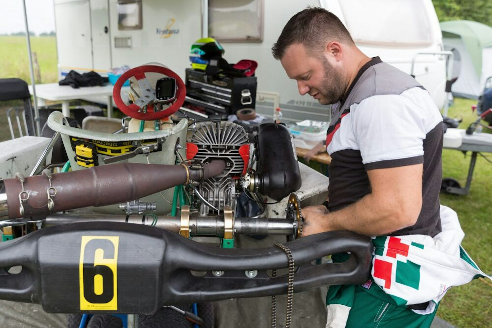 Dass auf der Strecke auch Mal etwas schief geht, bleibt nicht aus. So musste Patrick Labusch aus Much nach dem ersten Lauf an seiner Tony Kart Vortex Reparaturarbeiten vornehmen. „Man sieht, ich habe eine Schraube locker“, scherzte der Fahrer und Organisator der GKC 100-Gruppe (Gentlemen-Kart-Challenge). Der 36-Jährige betreibt seit Ende der 90er Jahre Kartsport. In Hahn ist er mit seinem Team zum ersten Mal dabei. „Die Kartrennen haben uns allen gefehlt. Ich hoffe, dass wir nun wieder öfter auf der Strecke sein können“, so Labusch. Seinen Teamkollegen Jannick Niessen konnte er wegen der Probleme am Kart im ersten Lauf nicht mehr einholen. Für Labusch geht es aber ohnehin eher um den Spaß. „Es ist in erster Linie ein Hobbysport.“