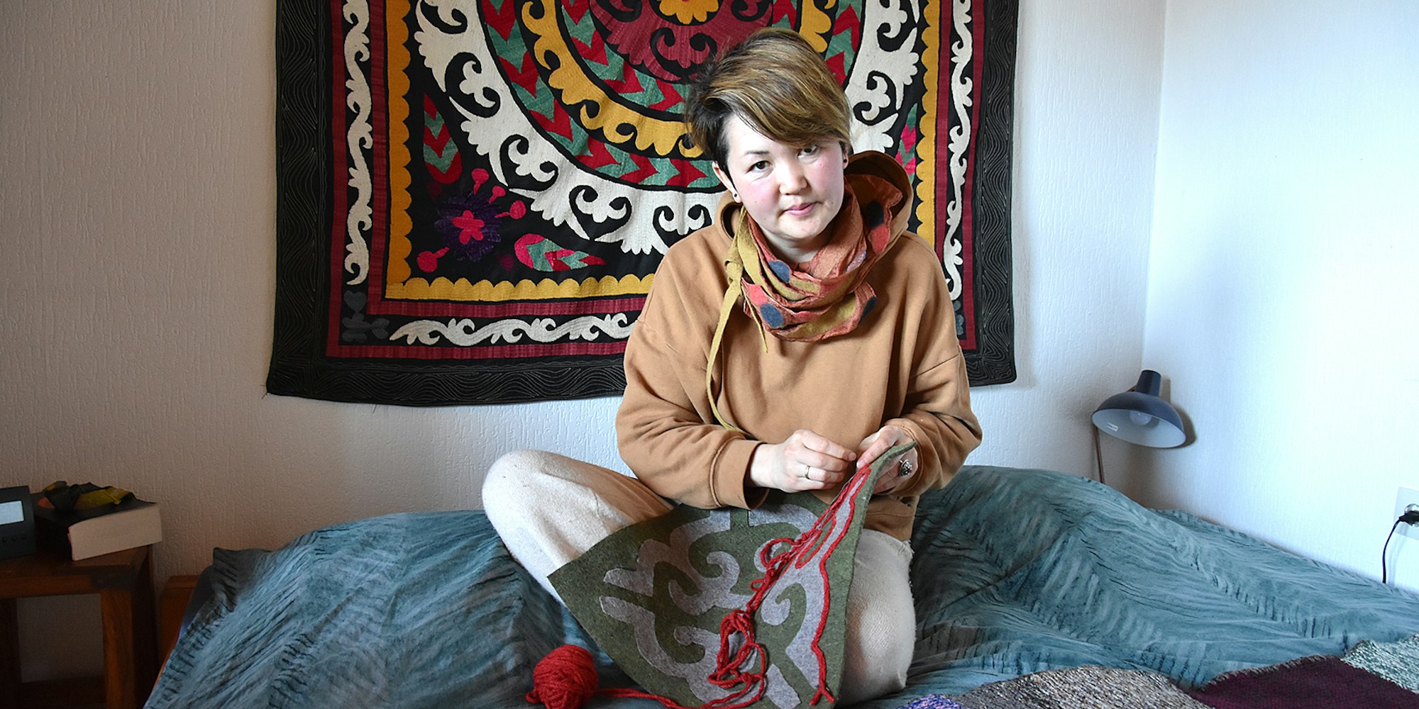 Von der Sonnenterrasse des Einfamilienhauses geht der Blick über die oberbergischen Hügel. Drinnen leuchtet ein Läufer aus Filz im satten Rot, laden Kissen mit traditionellen Mustern zum Sitzen ein. Kirgisistan sei Filzland, erklärt die Hausherrin, und sie beschreibt, wie sie als Kind praktisch in der Werkstatt ihres Vaters aufwuchs, der die alte Familientradition im Dorf bis heute fortführt.