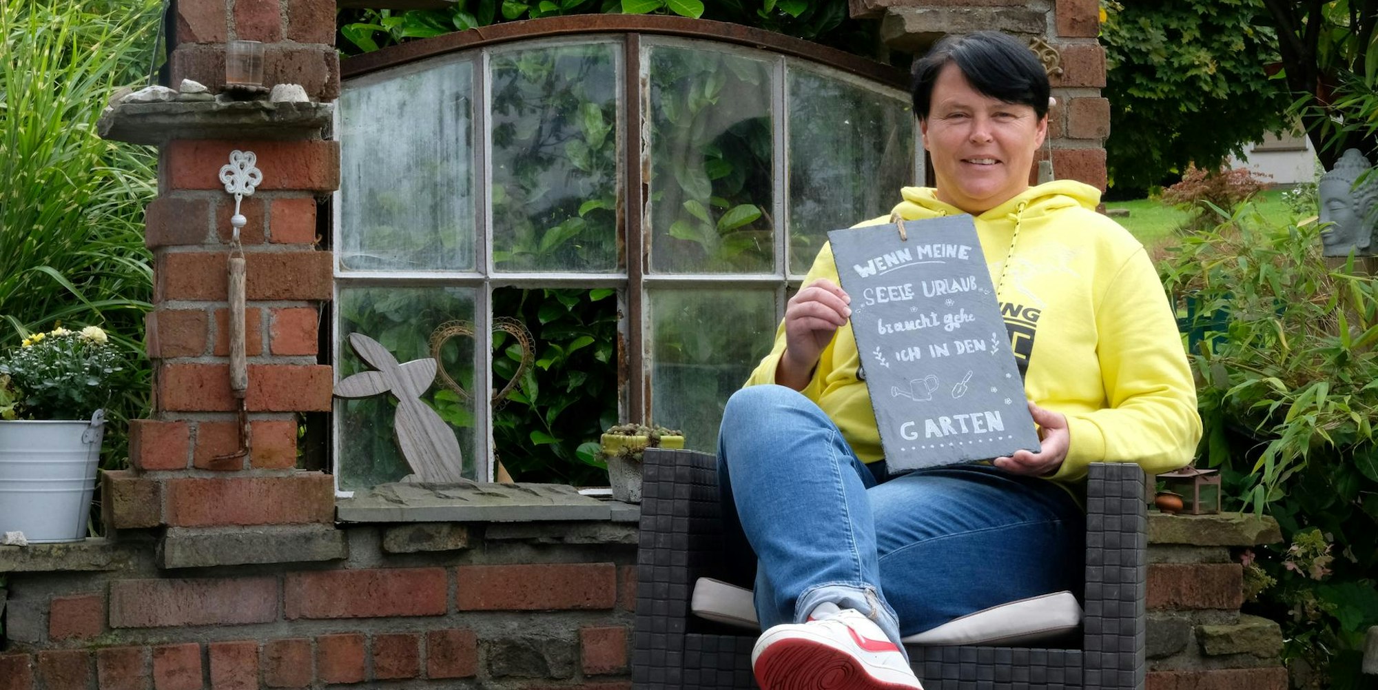 Ihren Lieblingsplatz hat Susanne Ranke sich kurzerhand selbst in ihrem Garten gebaut. Ein altes Fenster, das ihr eine Freundin überließ, ein Haufen Backsteine, etwas Deko und ein gemütlicher Sessel verwandelten sich vor rund sechs Jahren in einen idyllischen Sitzplatz. Und da der gesamte Freundeskreis der Hesperterin von ihrer Gartenleidenschaft weiß, lädt nun auch das entsprechende Schild dazu ein, sich vom wirklich sehr grünen Daumen und der Kreativität der 49-Jährigen zu überzeugen. „Ich kann alles brauchen. Manchmal dauert es etwas, bis ich eine Idee habe, wie ich die Dinge verbaue, aber irgendetwas ergibt sich immer“, verrät sie lachend.