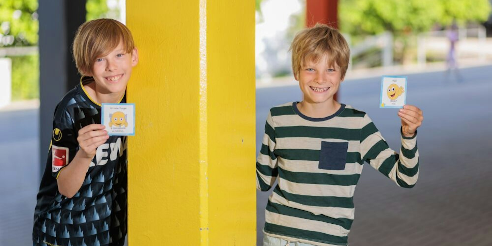 Mit Übersetzungskärtchen haben Ben (l.), Henri und die anderen Schulkinder erste Kontakte zu den Neuankömmlingen geknüpft.