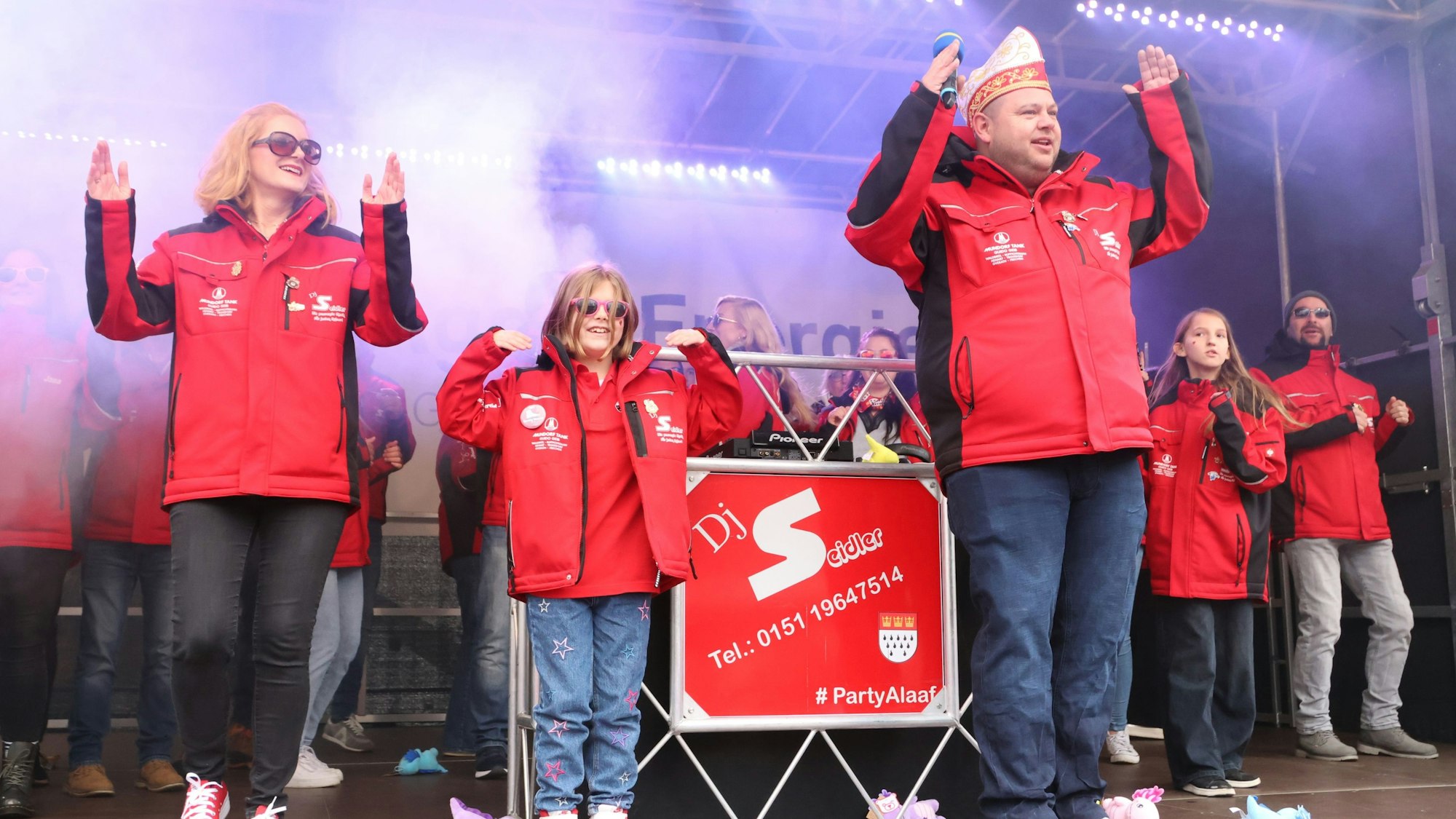 Jessica rief noch einmal Hansi Welter auf die Bühne, um sich bei ihm für seine Unterstützung zu bedanken. „Ich habe Aschermittwoch geschworen, ab jetzt im Karneval die Klappe zu halten, aber das klappt leider nicht immer“, verriet dieser launig. „Ihr habt die Herausforderung als Prinzenpaar prima gemeistert“, lobte er und animierte die Gäste zu einer Rakete. Jeanette Ginczek freute sich über zehn Neuzugänge bei den „Burgmäusen“, die gleich darauf ihren Tanz „Mäuse um die Welt“ präsentierten. Schwungvoll und akrobatisch ging es mit zwei Tänzen der „Pänz von der Burg“ weiter, bevor sich auf der Bühne Michél Seidel als designierter Prinz aus Unmengen Nebel auftauchend als DJ Seidler präsentierte. Gemeinsam mit seiner Prinzessin Elena und Tochter Lia Marie startete er mit „Makarena“ und einem wogenden Publikum in die neue Session.