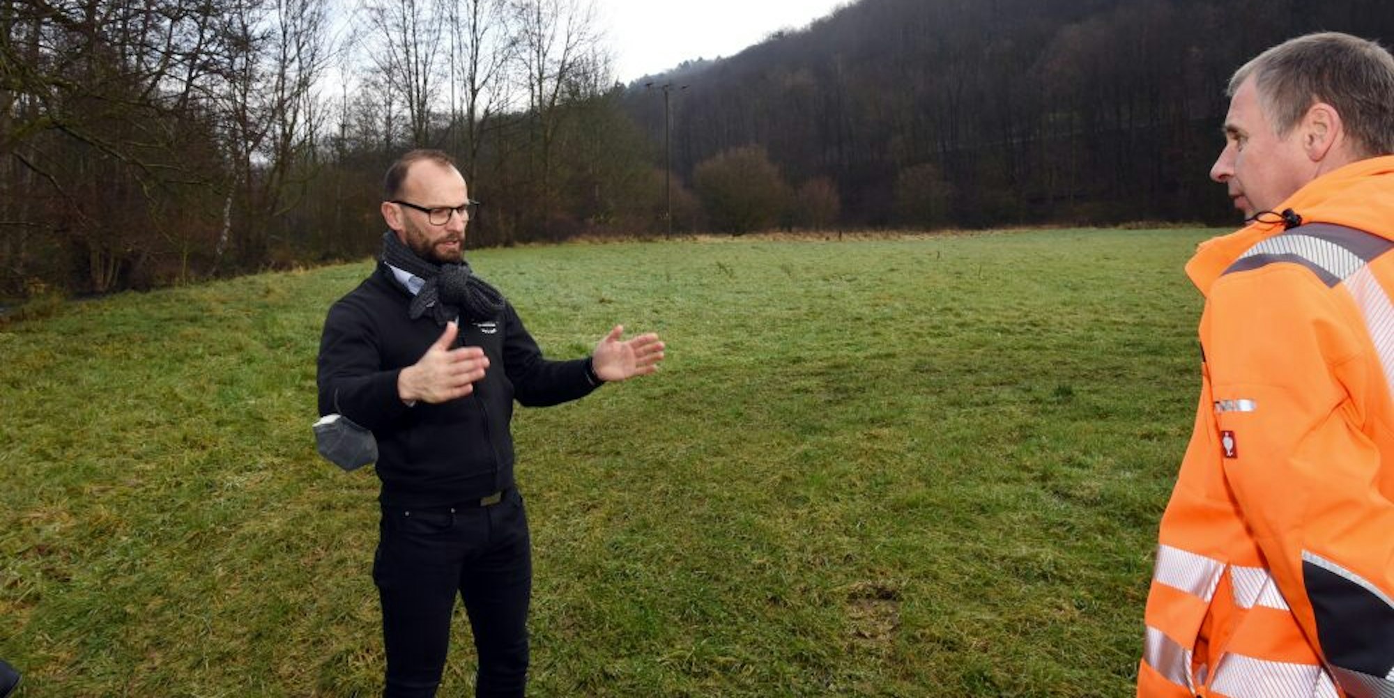 Wim Dissevelt (l.) zeigt in der Engelskirchener Blumenau, wo der Aggerverband eine Retentionsfläche für die Leppe schaffen will.