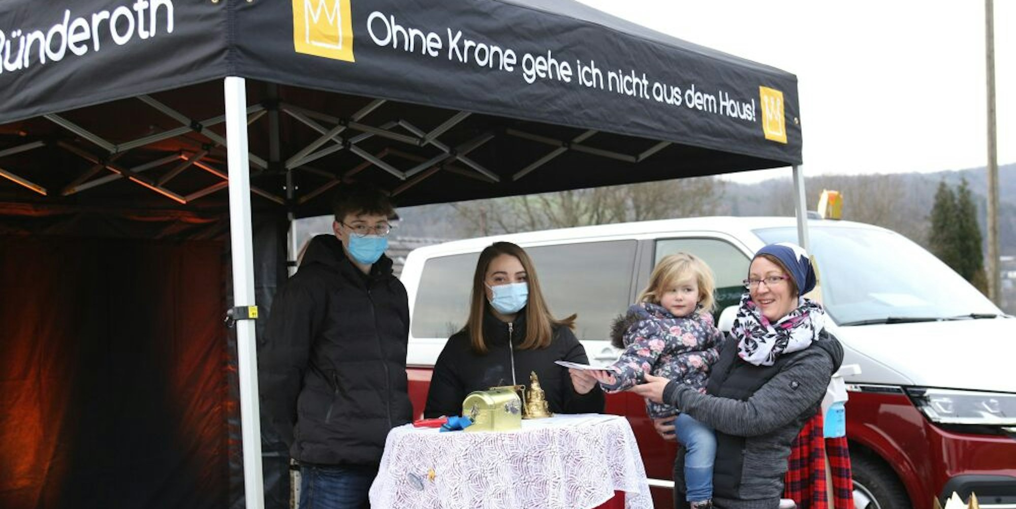 Anstatt von Tür zu Tür zu gehen, warten die Sternsinger aus Ründeroth auf Besuch, der zu ihnen kommt, denn so können sie die Corona-Schutzmaßnahmen bestmöglich einhalten. Unter dem neu angeschafften Pavillon mit Sternsinger-Aufschrift stehen an diesem Tag Christoph Schreiber, Sebastian Schäfer und Giulia Puccia, drei der Jugendleiter der Pfarrjugend St. Jakobus Ründeroth. „Bisher sind wir noch nicht erfroren“, sagen die drei und lachen. Der Wechsel mit weiteren Jugendleitern und Helfern ermöglicht es ihnen, sich nach jeder „Segens-Haltestelle“ kurz aufzuwärmen.