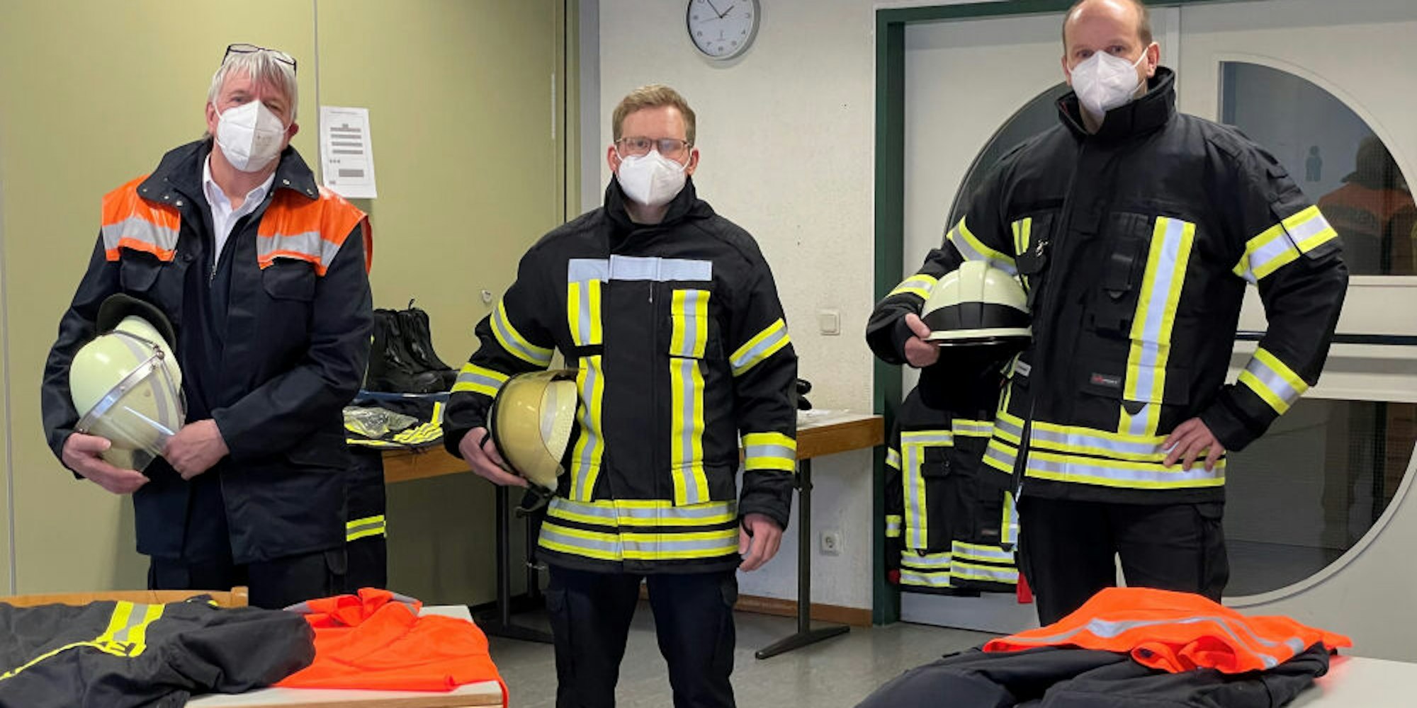 Drei Generationen von Einsatzkleidung zeigen (v.l.) Wilfried Fischer mit einer Jacke aus den 1990ern, Philipp Genge mit einem Modell aus den 2000er Jahren und Frank Raupach mit Brandbekämpfungsjacke und Helm nach heutigem Standard.