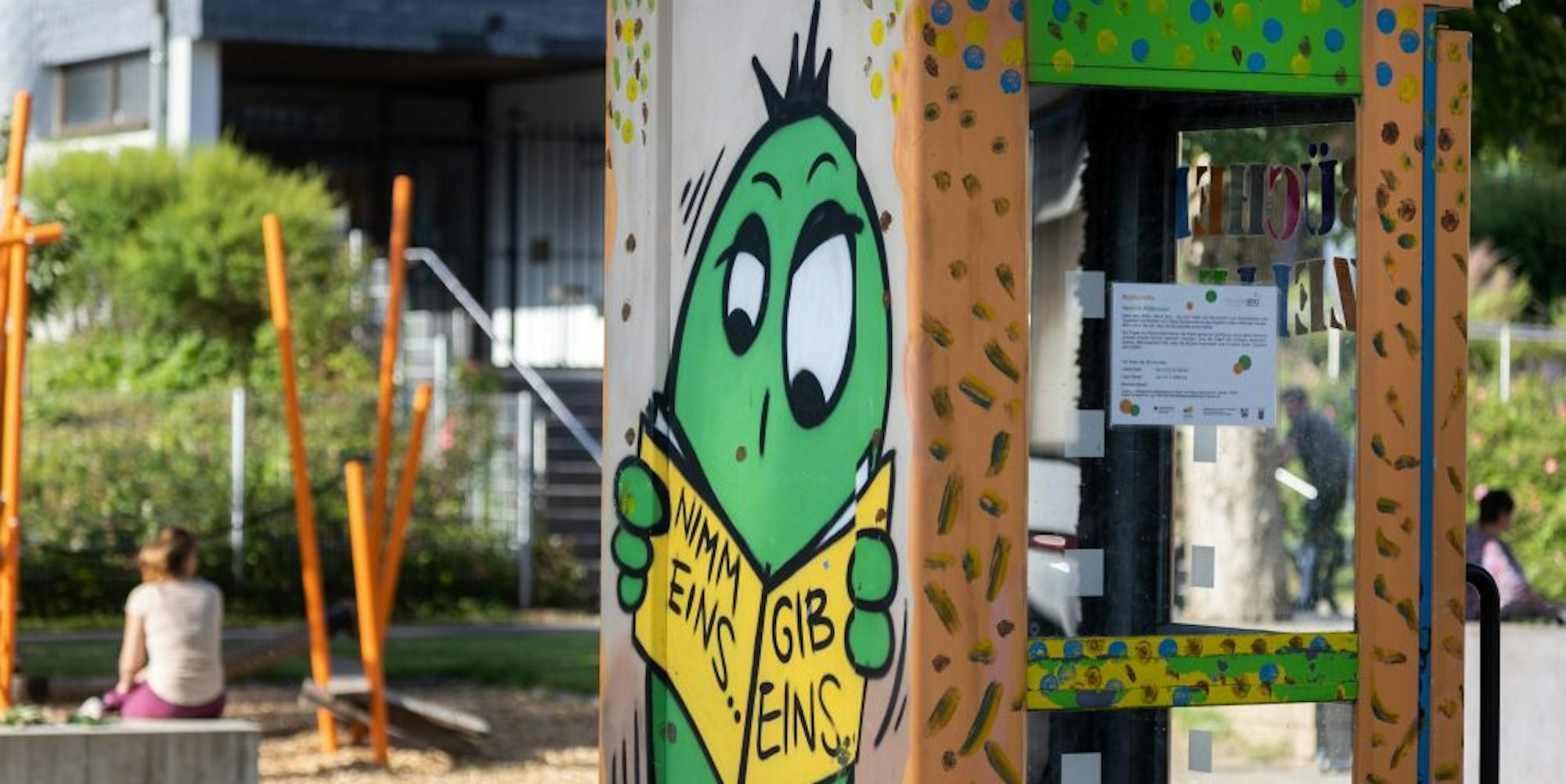 Einer grüner Bücherwurm ziert eine alte Telefonzelle auf dem Platz, der heute gesucht wird.