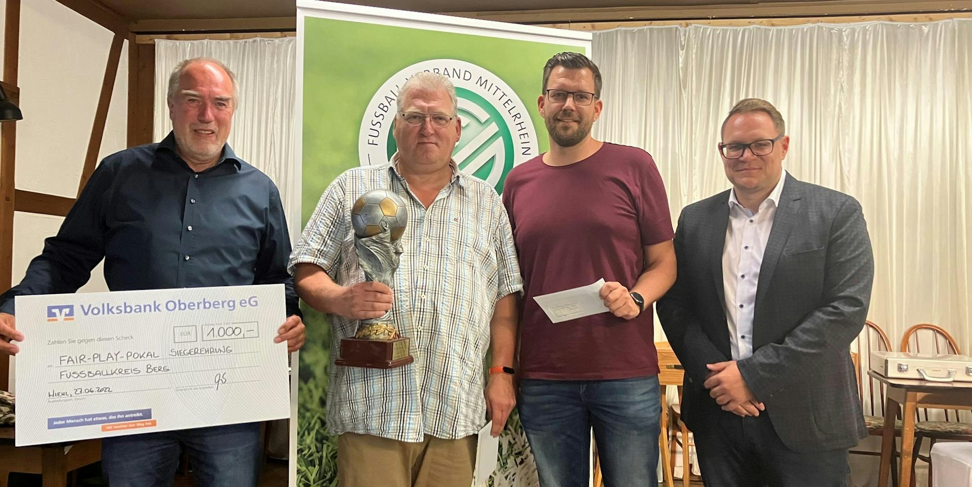 Jürgen Liehn, Vorsitzender des Fußballkreises, überreichte den Pokal. Wer diesen zuerst mit nach Hause nimmt, musste am Abend noch überlegt werden. Darüber hinaus gab es für die besten zehn Vereine Preisgelder. Die Volksbank Oberberg unterstützt den Wettbewerb mit 1000 Euro.