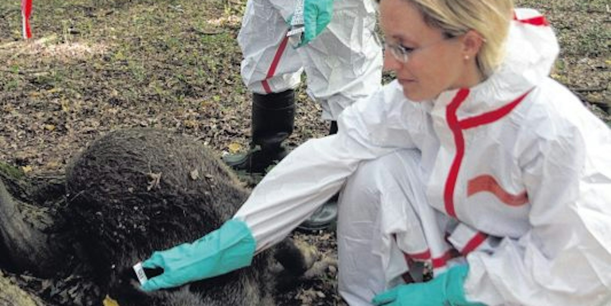Bedenklicher Fund: Die Tierärzte Dr. Ines Tavernaro und Jörg Trestik markieren einen Wildschwein-Kadaver.