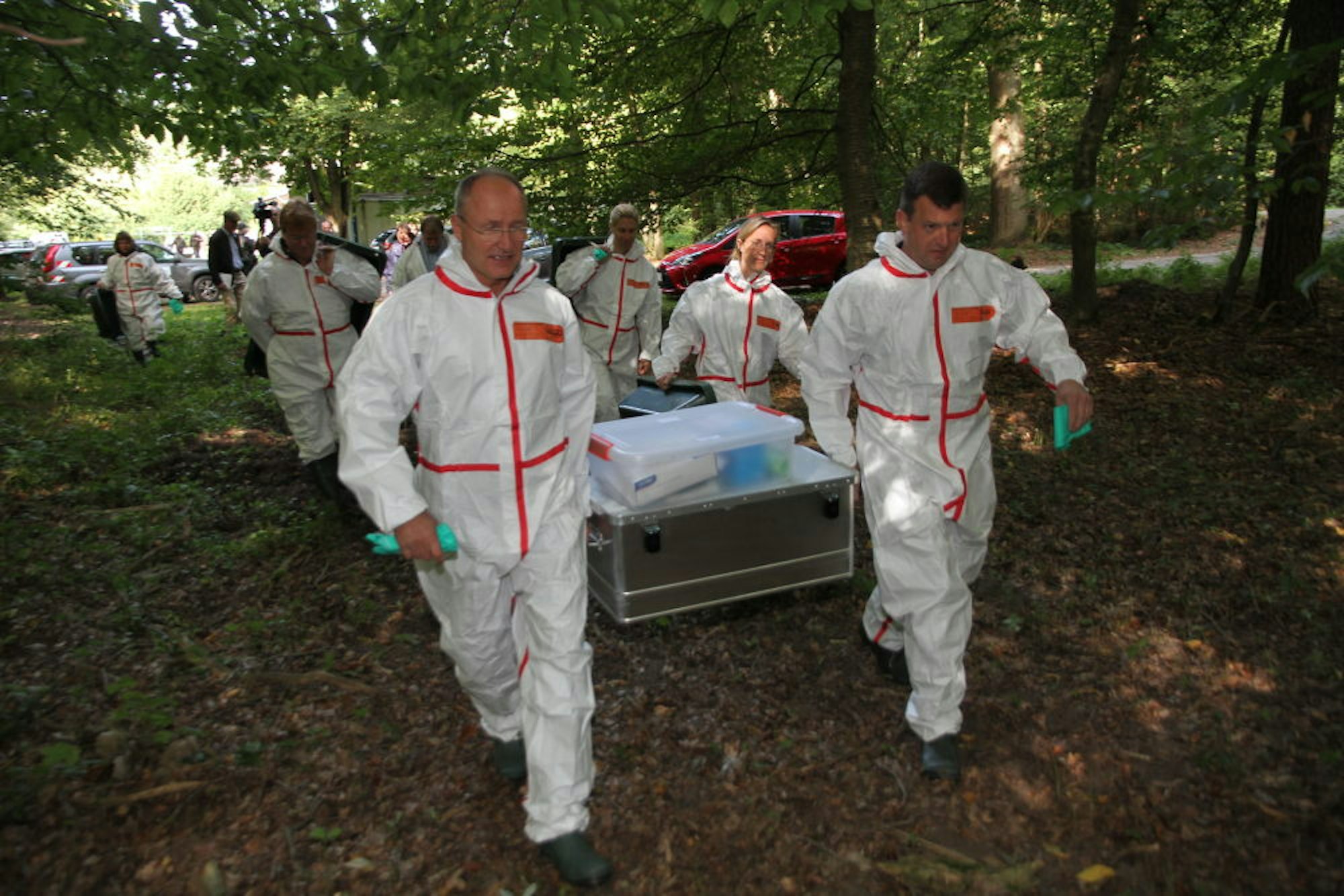 Die Funde wurden markiert, die Umgebung wurde abgesucht, dann wurden Trassen für den Abtransport von störendem Astwerk befreit. Drei bis vier Mitarbeiter waren nötig, um die schweren Kadaver in Säcke zu packen – Schwerstarbeit, noch dazu in den dichten weißen Schutzanzügen: „Da schwitzt man drunter, schon alleine bei dem Gedanken“, stellte Thomas-Hans Deckert fest, stellvertretender Leiter des Forstamts Eitorf. Er hat noch den Ausbruch der Europäischen Schweinepest 2009 in Erinnerung: „Die haben wir durch Impfungen und Bergung in den Griff bekommen.“