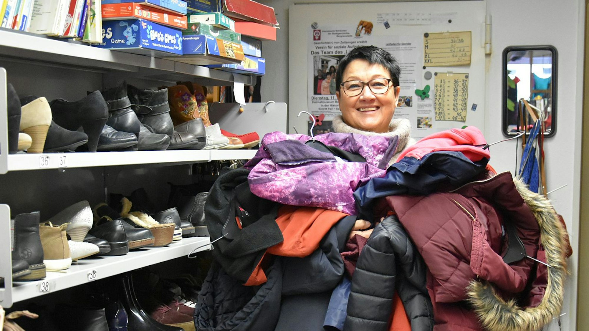 Zu schade zum Wegwerfen: Tatjana Zimmer, Ehrenamtliche vom Bergneustädter Lädchen, mit gespendeten Winterjacken. Viele Menschen nutzen die Altkleidercontainer des Bav, um aussortierte Textilien loszuwerden.