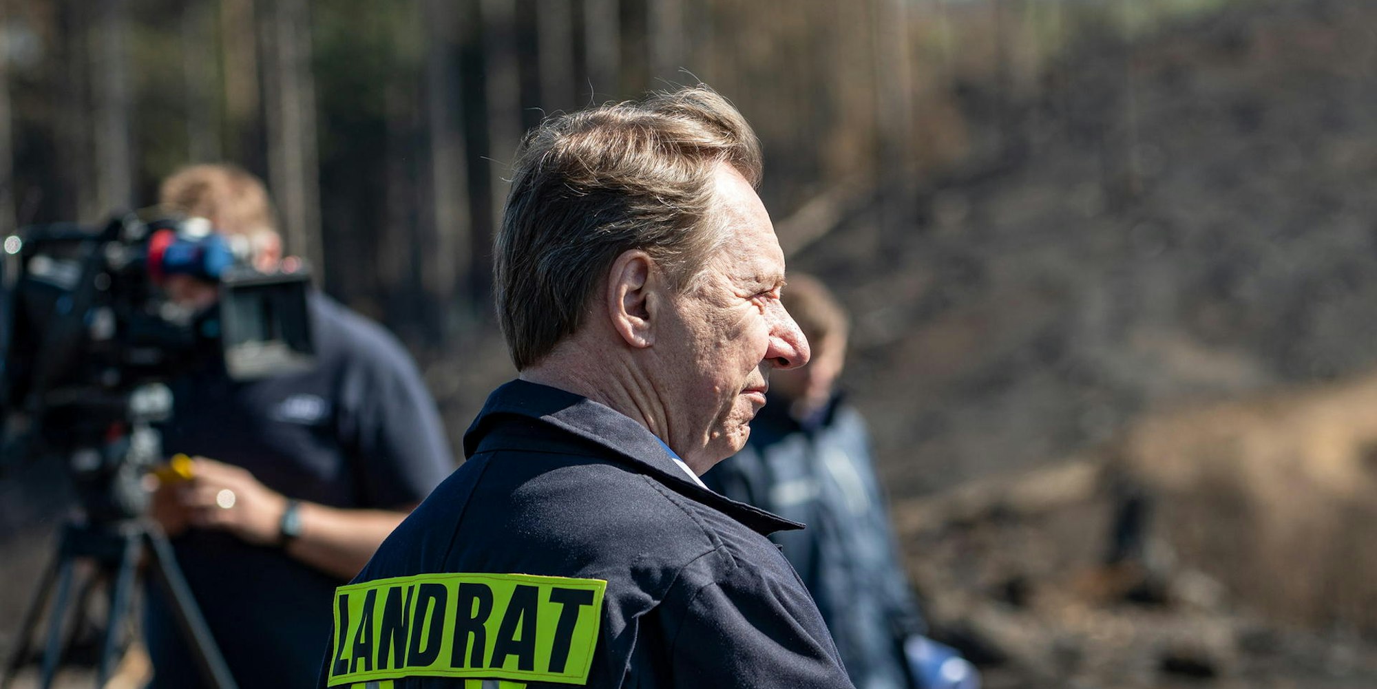 Landrat Jochen Hagt auf dem abgebrannten Homerich: Er mahnt alle Bürger, sich achtsam im Wald zu bewegen.
