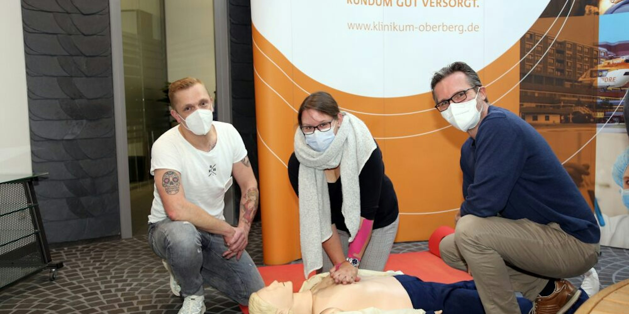Pfleger Martin Robbins (l.) und Dr. Jörg Niehüser-Saran zeigen Vanessa Tröder, wie die Herzdruckmassage funktioniert.
