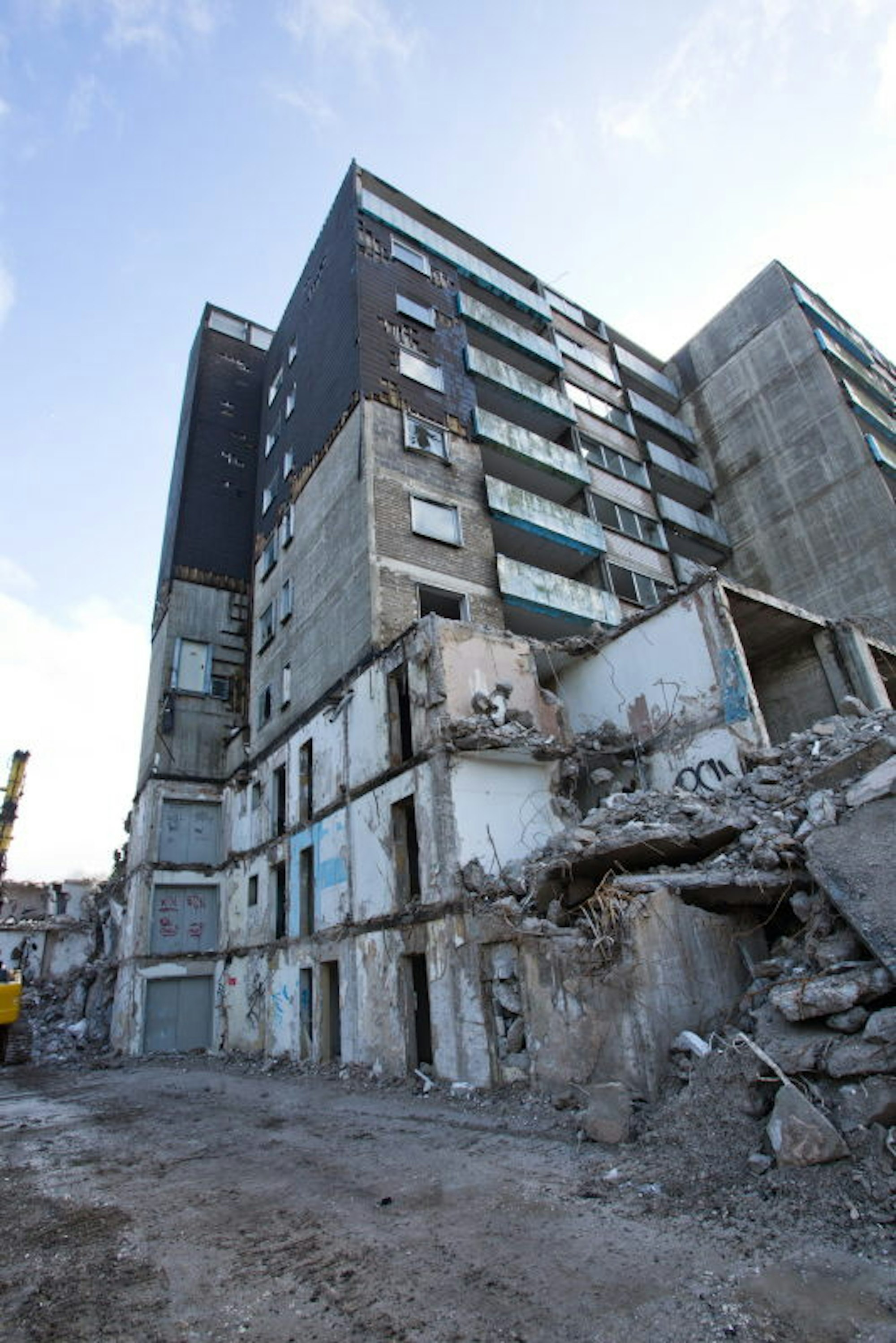 Denn: In spätestens zwei Wochen greift ein 80 Tonnen schwerer Bagger von oben an. „Damit erreichen wir eine Höhe von maximal 32 Metern und brechen von oben ab“, sagt Sachs. 27 Meter misst die Merkur-Brache zurzeit an ihrer höchsten Stelle. Und wird der Schutt dort nicht gebraucht, so soll er erneut auf Belastungen überprüft werden. „Danach könnte er eventuell im Straßenbau zum Einsatz kommen“, überlegt Fachmann Peikert und verspricht, dass kein Merkur-Klumpen in den geplanten neuen Immobilien weiterlebt. Auf der Baustelle wundert er sich, wie wenig Moniereisen in den Wohnungen verbaut worden ist: „Heute findet man davon viel mehr in den Wänden.“