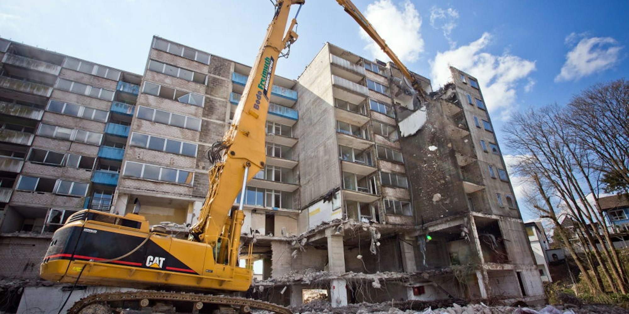 Waldbröl – Das Krachen ist gewaltig. Ist aber auch kein Wunder, 27 Meter sind schließlich eine gewaltige Fallhöhe. So tief fallen gerade große Betonbrocken, so hoch ist nämlich der Merkur-Komplex in der Stadtmitte Waldbröls. Doch nicht mehr lange: Die Männer des Spezialunternehmens Bodo Freimuth aus Bülkau (bei Cuxhaven) geben alles, um den maroden ungeliebten Bau aus den 1970er Jahren kleinzukriegen. Das tun sie mit dem Longfront Cat 5080. Klingt technisch. Und das ist es auch.