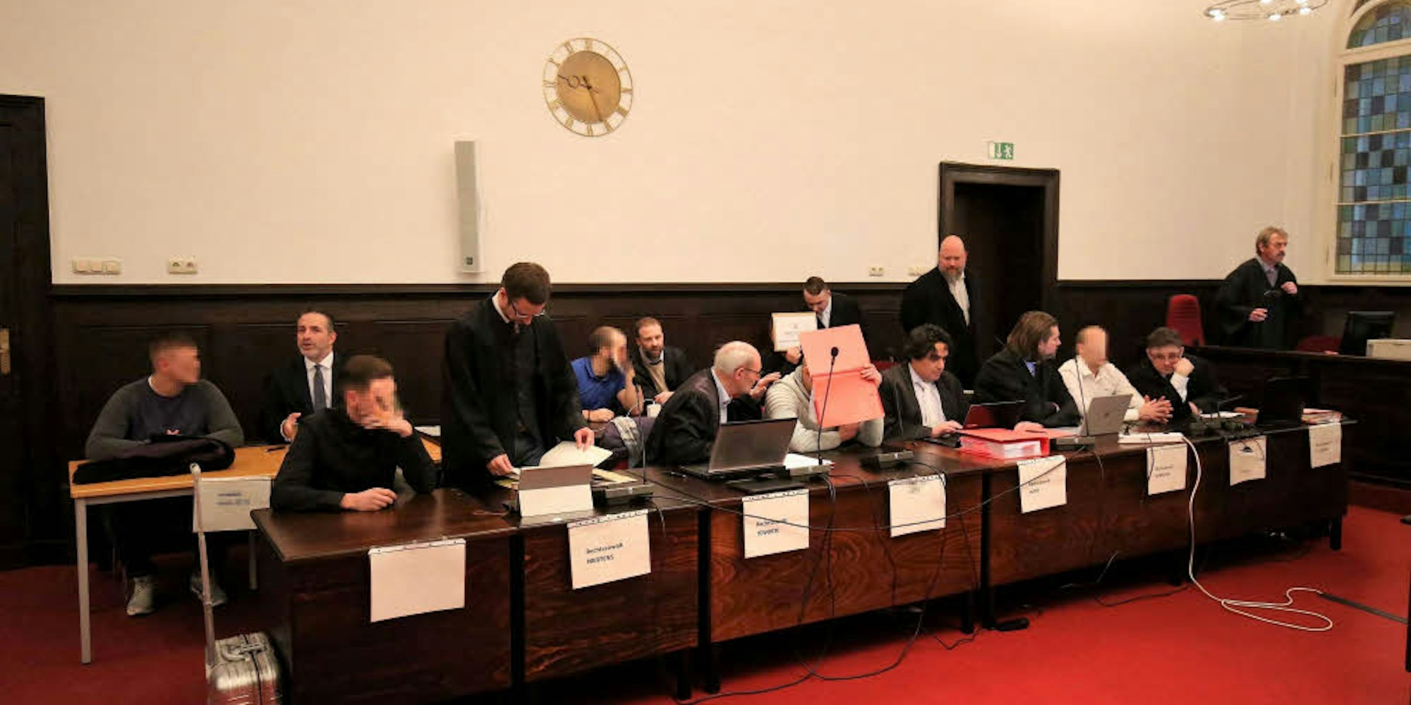Drei der Beschuldigten sind auf freiem Fuß, die übrigen werden in Handschellen in den Schwurgerichtssaal des Landgerichts gebracht. Zwei der Angeklagten lassen durch ihre Anwälte erklären, dass sie zu einem späteren Zeitpunkt zur Aussage bereit seien, die übrigen wollen sich schweigend verteidigen.