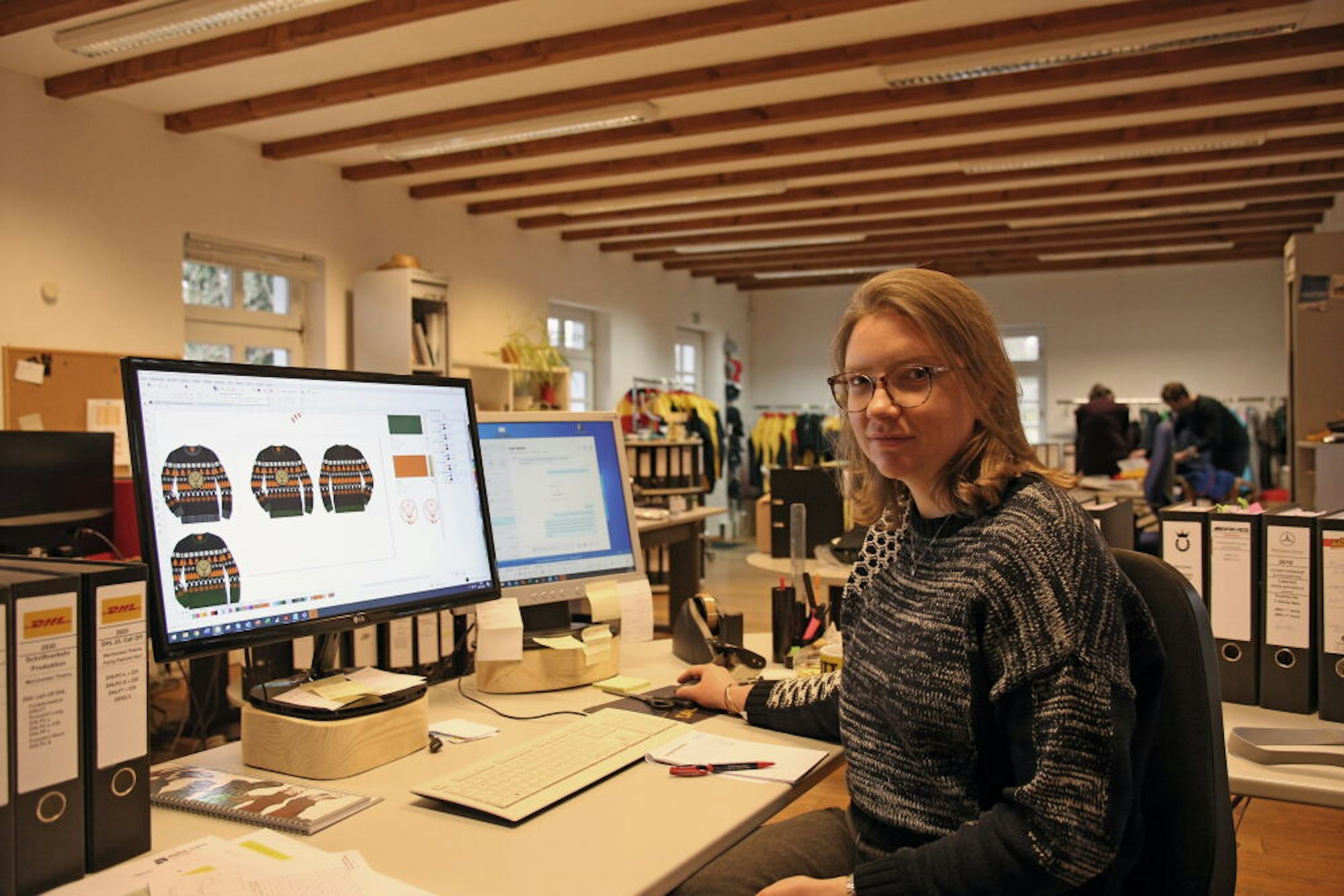Designerin Darja Gontscharow zeigt Entwürfe für den Jägermeister-Pullover.