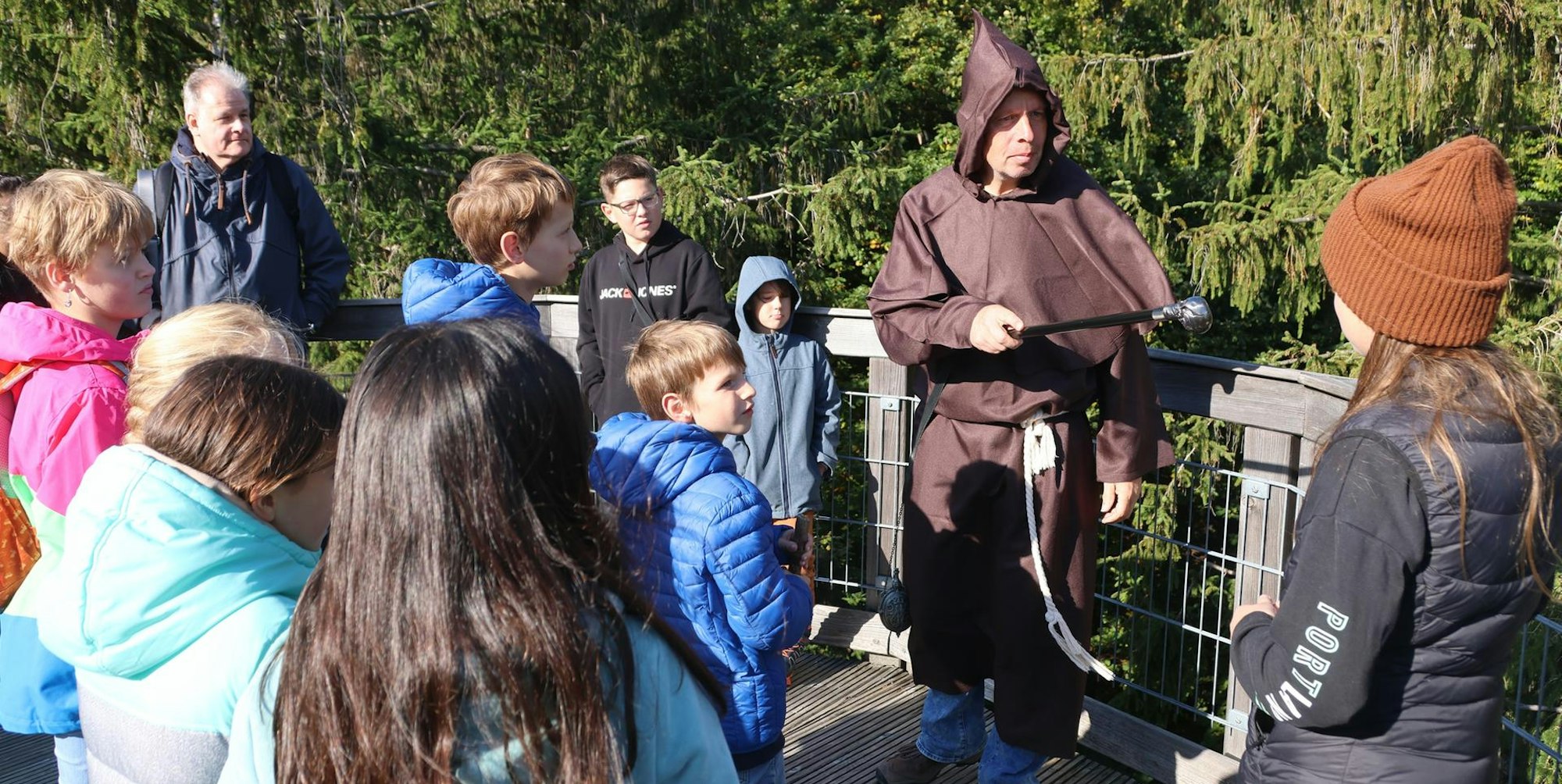 Waldbröl – „Ich begrüße Sie zur Oberbergischen Burgen- und Denkmal-Führung – mit anschließendem Test“, erklärt „der verrückte Mönch“ (Patrick Mielke) in seiner braunen Kutte im Naturerlebnispark Panarbora seiner Zuhörerschar. Die hatte sich eigentlich für eine der „Grusel-Grausel-Führungen“ angemeldet. Die werde aber erst in einer Stunde starten, erklärt der Mönch den Verdutzten. Zunächst breitet sich ungläubiges Staunen aus, doch dann hellen sich die Minen auf, als die Gruppe den Schwindel des Abteilungsleiters Natur und Umwelt schließlich durchschaut.