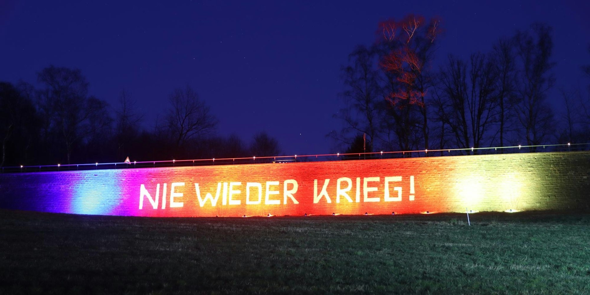Statement gegen den KriegWaldbröler Friedensmauer angeleuchtet