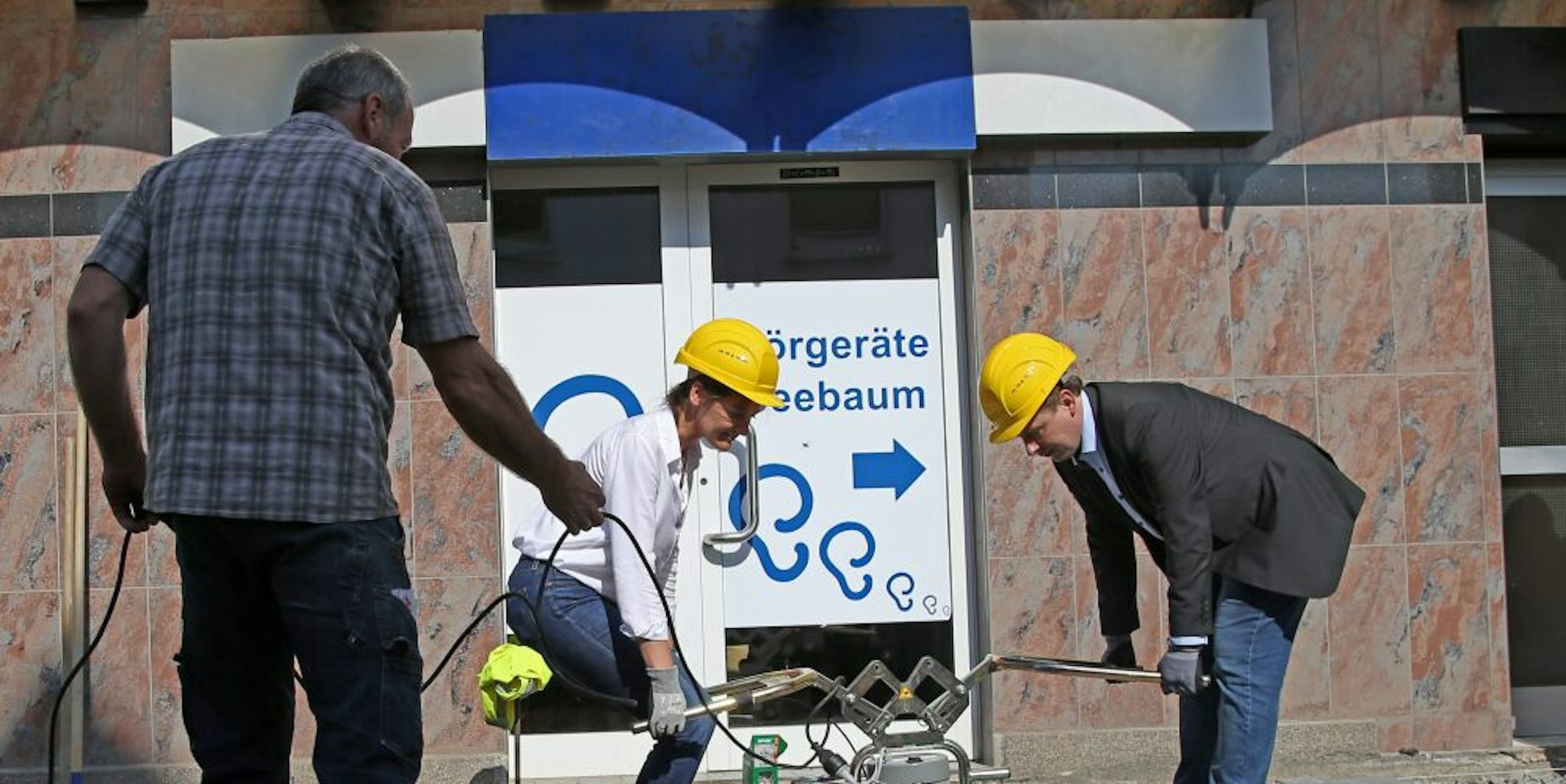 Waldbröl – Für ein paar Minuten müssen auch Bürgermeisterin Larissa Weber und Thomas Raithel, neuer Regionalniederlassungsleiter Rhein-Berg des Landesbetriebs Straßenbau, ran: Gute 70 Kilogramm wiegt der Steinquader, den die beiden mit einem Vakuumheber höchst akkurat ins Gehwegpflaster der Kaiserstraße hieven, angeleitet von Straßenbaumeister Stefan Mörschel. Er und viele seiner Kollegen sowie Anwohner, Geschäftsleute, Vertreter des Rathauses und Mitglieder des Stadtrats haben am Donnerstag mitten auf der Baustelle Bergfest gefeiert: Unter der Erde ist Waldbröls Verkehrsmeile fertig, überirdisch geht’s jetzt weiter.