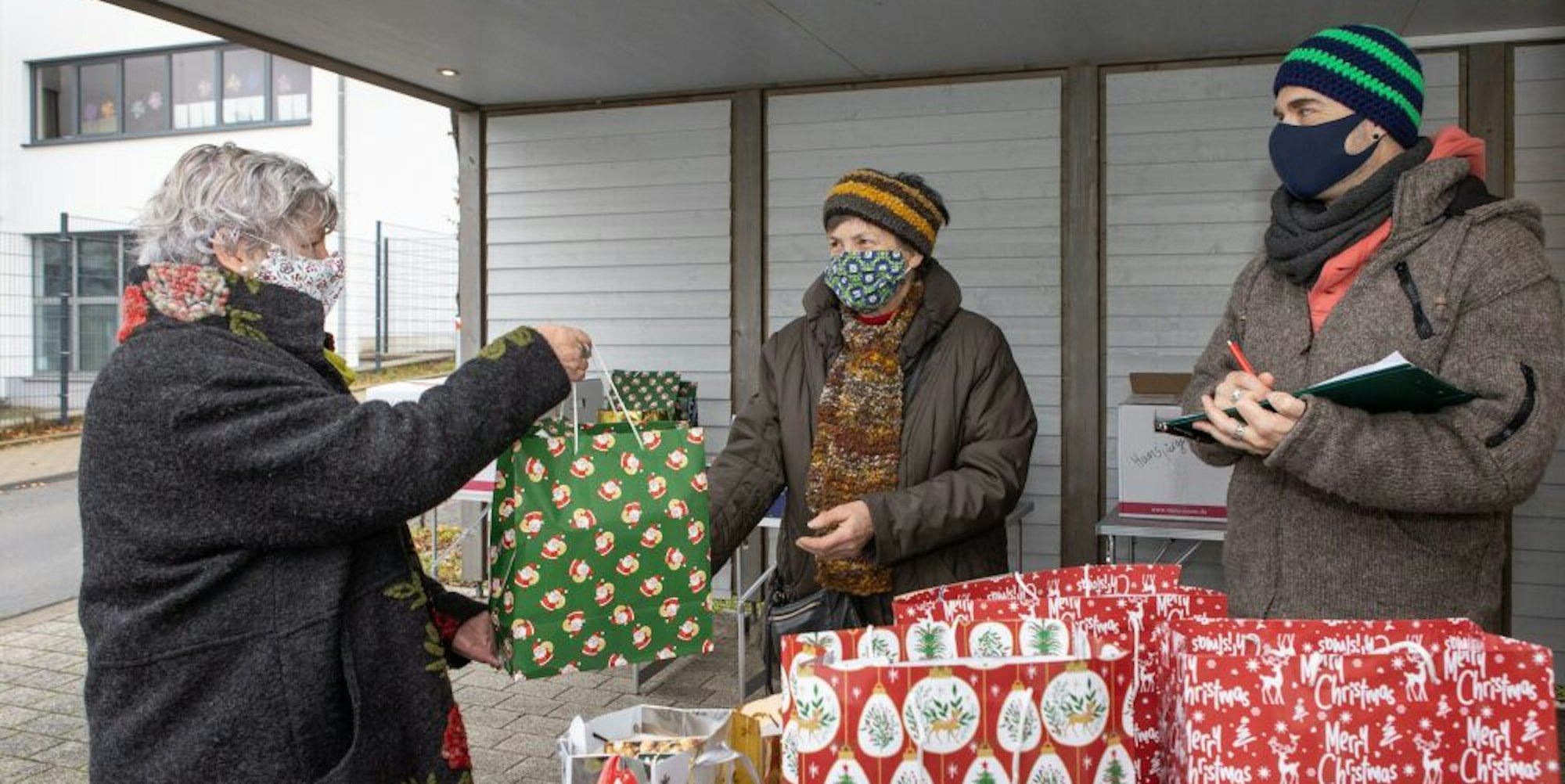 Tagelang hatte Margrit Brüser mit Helferinnen und Helfern vom Asylkreis eingekauft, Babyspielzeug für die Kleinsten, ein Malbuch oder ein Vorlesebuch für die größeren Kinder, ein Glas mit Leckereien für die Erwachsenen, dazu mal ein gestrickter Schneemann, ein paar Wollsöckchen, ein Puzzle oder ein Kalender, alles liebevoll verpackt. In jeder Geschenktüte steckt auch eine Grußkarte mit einem Foto von der Feier im vergangenen Jahr.