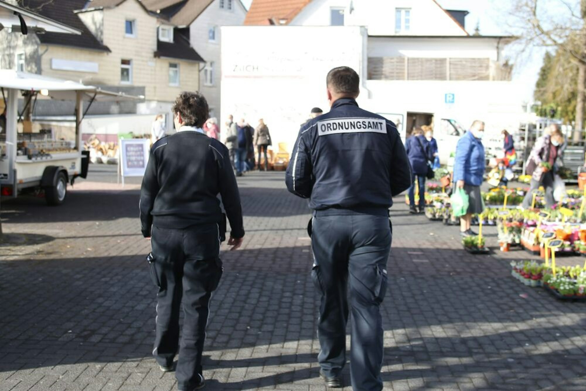 Dafür gelten ab sofort und bis auf Weiteres strenge Regeln: Wer einkaufen will, muss Abstand halten. Und wer einkauft, muss eine FFP2- oder OP-Maske tragen. Darauf achten auch die Kräfte der Polizei und des Ordnungsamtes: Eine Kundin, die ein Halbvisier vor dem Gesicht hat, wird sofort angehalten und muss ein Attest vorlegen, dass sie von der Maskenpflicht befreit. „Denn auch Visiere sind nicht erlaubt“, erklärt die Mitarbeiterin des Ordnungsamtes, die prompt einen weiteren Besucher stoppt: Er trägt keine Maske.