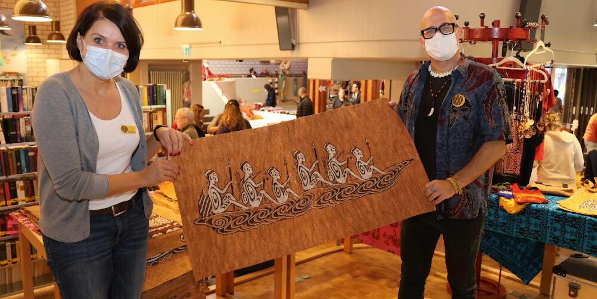 Miba-Helferin Tanja Lemmer und Basar-Organisator Maic Stausberg zeigen ein Rindenbild aus West-Papua.