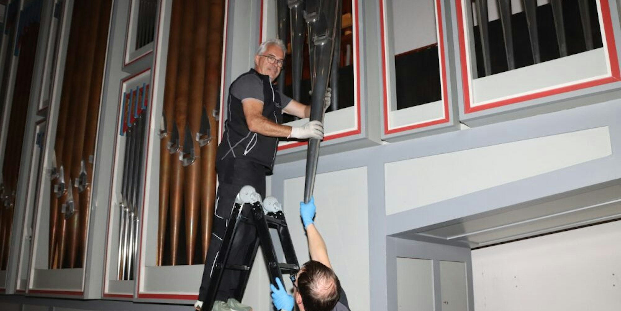 Mit viel Vorsicht demontiert Stefan Peters (auf der Leiter), Inhaber der Klavier- und Orgelmanufaktur, eine der Prospektpfeifen.