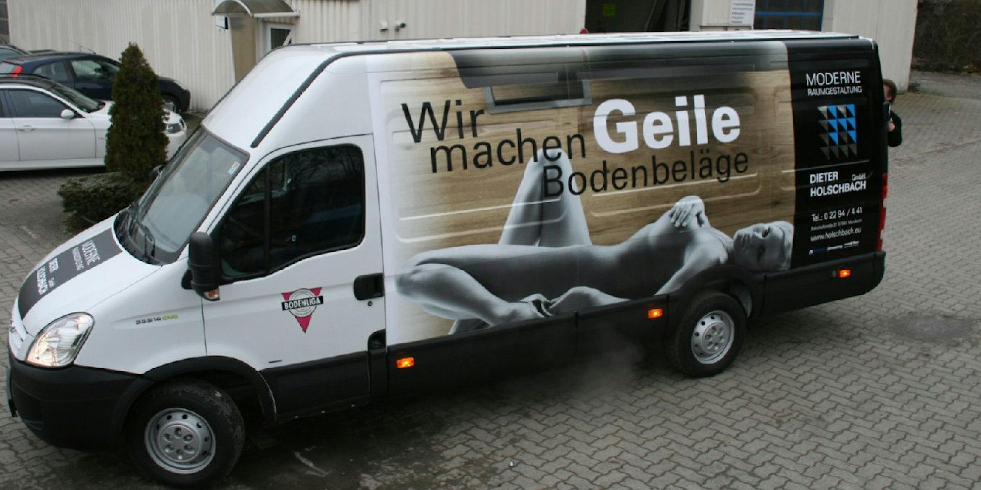 Frauenfeindliche Werbung? Motiv und Slogan auf zwei Lieferwagen eines Morsbacher Raumausstatters wurden jetzt vom Deutschen Werberat gerügt. (Foto: timtomtext)