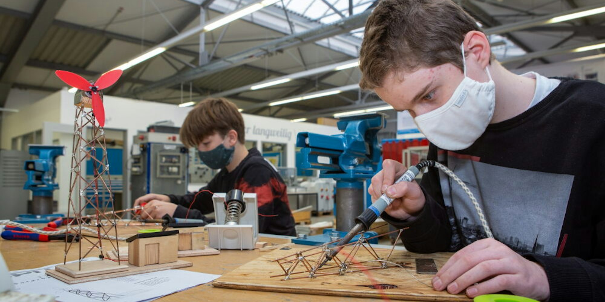 Mühlen – Alexander Brück (13) und Ruben Backhaus (14) haben gar nicht wirklich Lust, so viele Fragen zu ihrem Tagespraktikum beim Wiehler Unternehmen Kampf Schneid- und Wickeltechnik zu beantworten. Viel lieber wollen die beiden Schüler der neunten Klasse des Dietrich-Bonhoeffer-Gymnasiums ihren solarbetriebenen Propeller fertig zusammenlöten. Löten, kleben, feilen, sägen – das alles durften die beiden an diesem Tag in der Ausbildungswerkstatt im Zuge der MINTeraktiv Herbstakademie unter dem Motto „Konstruiere die Zukunft – zeig Kampfgeist!“ ausprobieren.