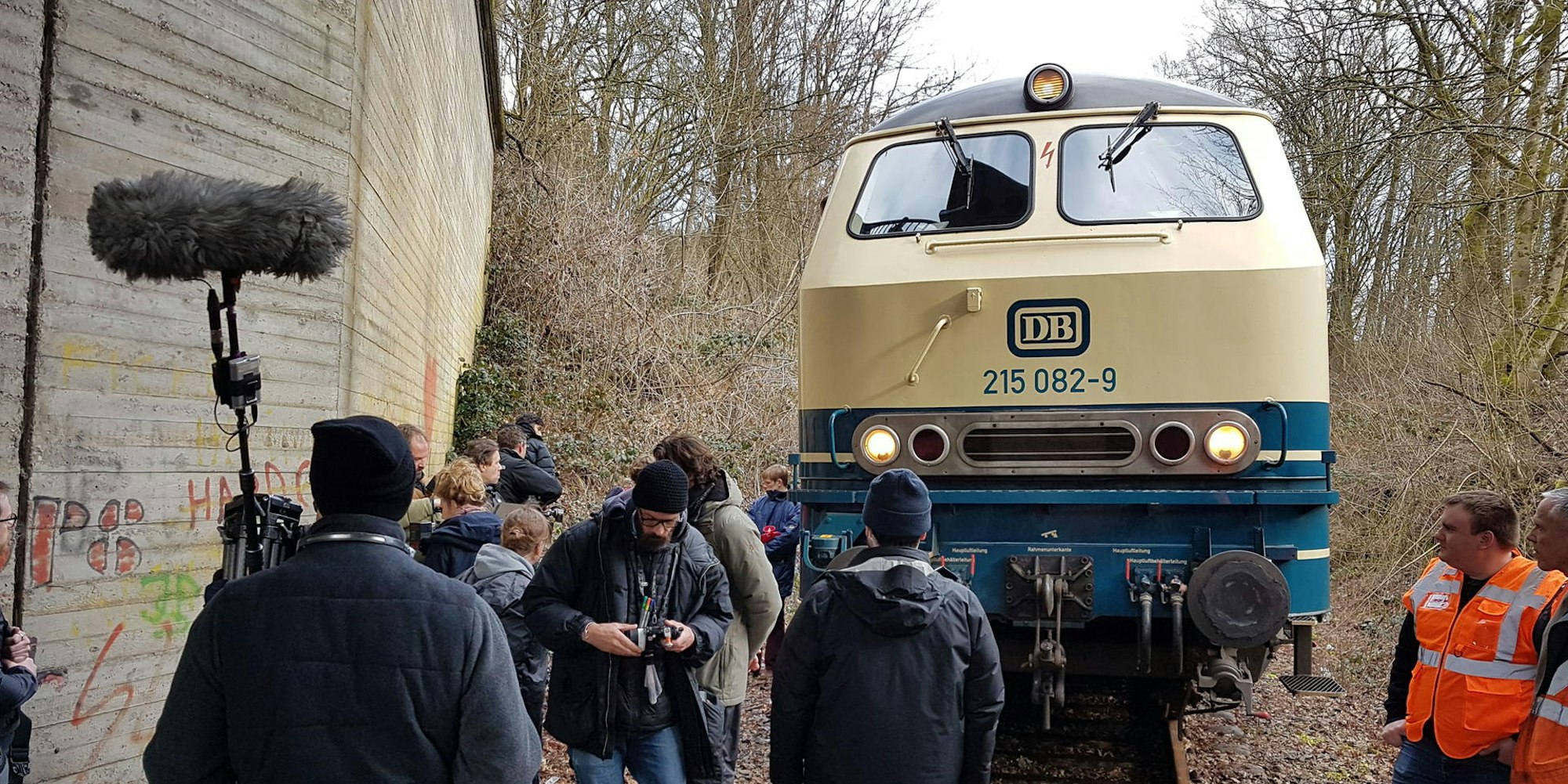Um diese Schlüsselszene in den Kasten zu bringen, hatten die Produzenten bereits im Januar Kontakt zum Förderkreis zur Rettung der Wiehltalbahn aufgenommen, berichtet dessen Vorsitzender Gerhard Mansel. Zwei seiner Bekannten hatten die Filmleute auf die Oberberger gebracht, berichtet der Marienheider (67): „Sie arbeiten im Eisenbahnmuseum Köln-Nippes, wo Bahnszenen für ,Babylon Berlin’ gedreht wurden.“ Gemeinsam mit sogenannten Location-Scouts besichtigte Mansel den vorgesehenen Drehort: An der Autobrücke der Dreibholzer Straße über das Gleis begannen vergangene Woche am frühen Montagmorgen die Filmarbeiten, die sich bis in die Abendstunden hinzogen.