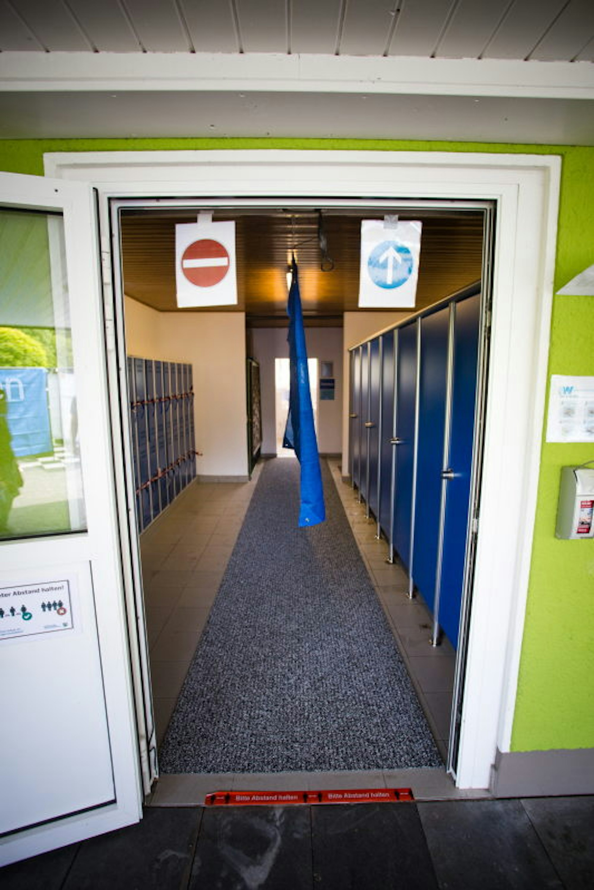 Der Junge weiß, wie die Sache läuft: Rechts geht es hinein zu den Einzelumkleiden. Das zeigen die Markierungen am Boden und die große Plane, die von der Decke hängt. Auf der linken Hälfte des Wegs geht man wieder nach draußen. Überall hängen die bekannten Schilder mit den Hinweisen: Abstand halten, Hände desinfizieren, Nieß- und Hustenetikette bewahren. Im Eingangsbereich des Freibads besteht Maskenpflicht.