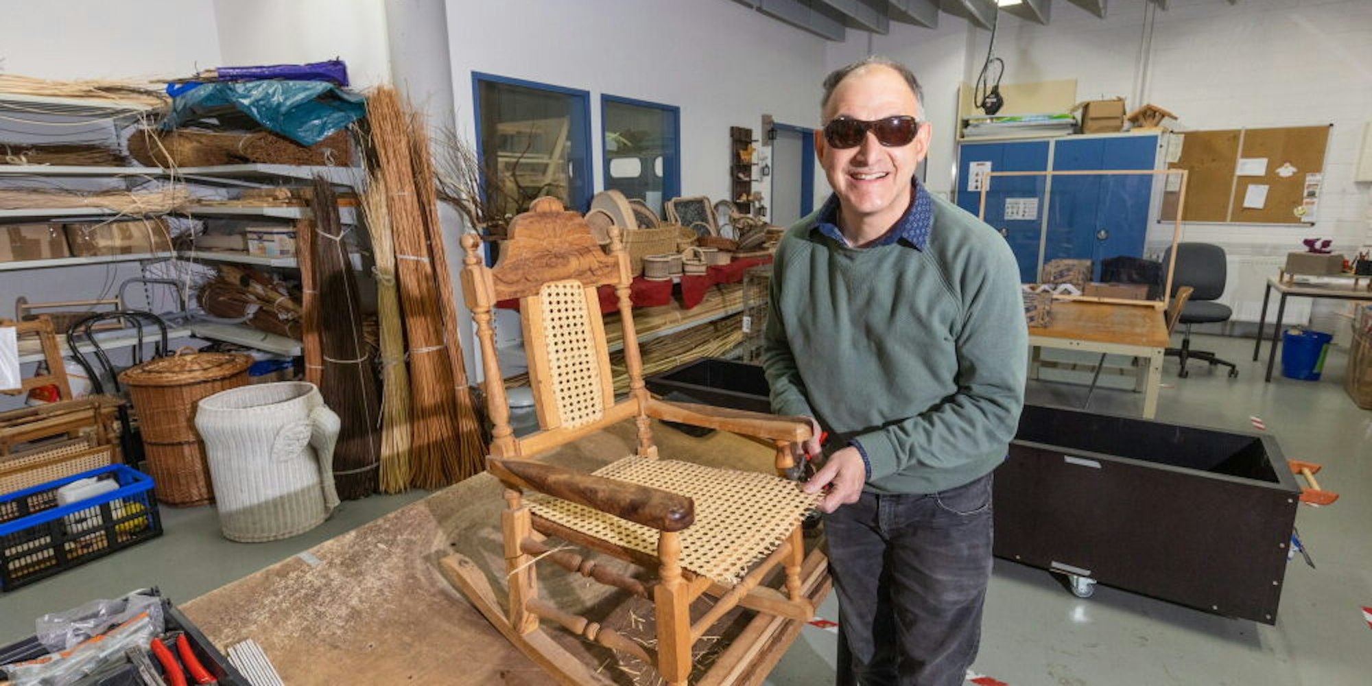Gehörlos und fast blind, aber ein Profi: Oliver Ley stellt in Faulmert unter anderem filigrane Stuhlgeflechte her.