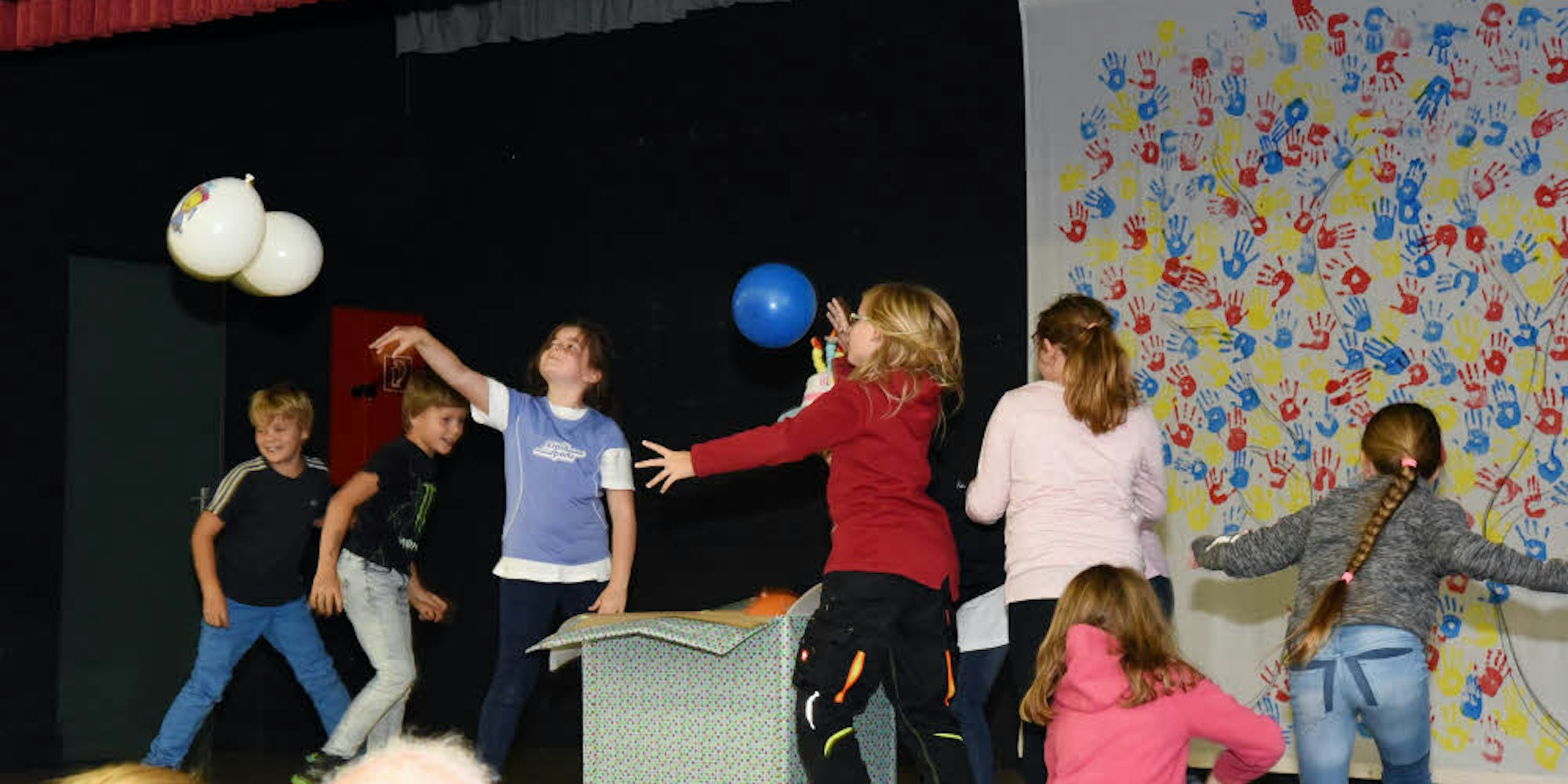 Zu Beginn der bunten Feierstunde packten Schüler ein großes Geschenk aus. Zum Vorschein kamen Luftballons und der Schriftzug „Jubiläum“.
