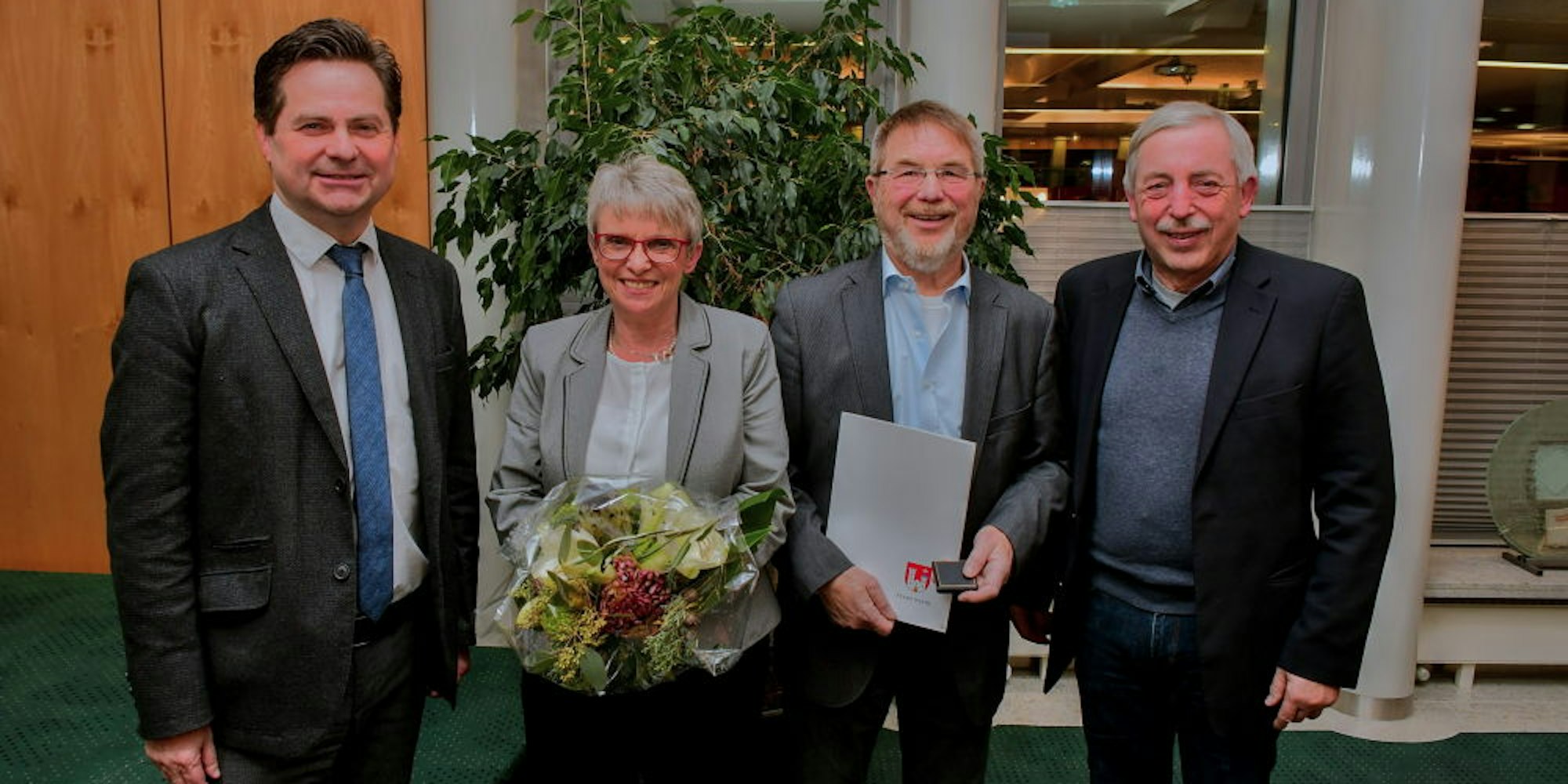 Zum Abschied vom Vorsitzendenamt wurde das Engagement von Gerhard Hermann (2.v.r.) und seiner Frau Iris von Bürgermeister Ulrich Stücker (l.) und seinem Vorgänger Werner Becker-Blonigen (r.) gewürdigt.