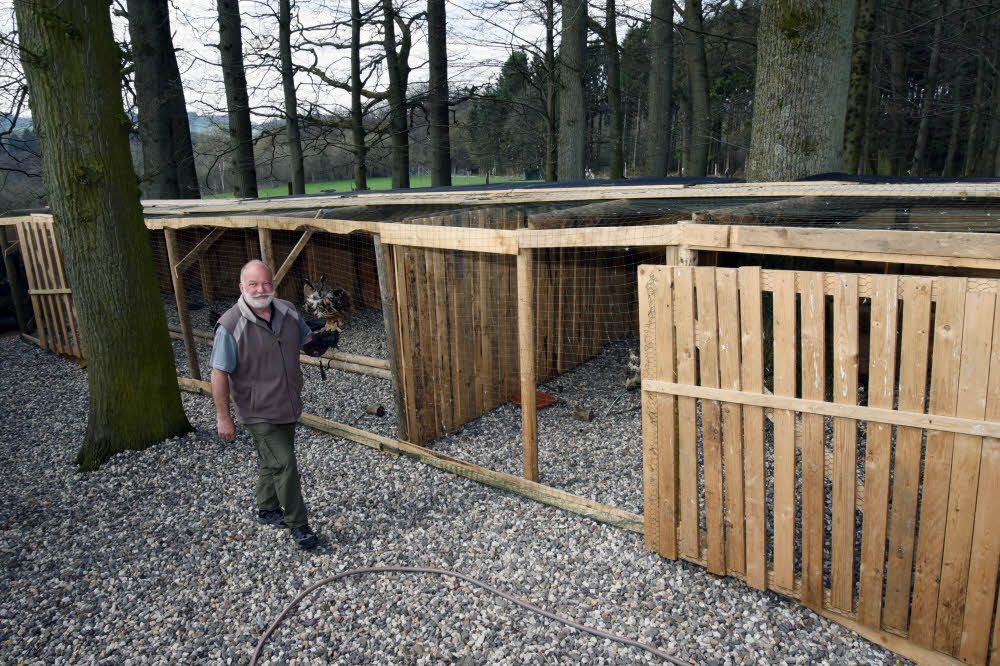 Uhu zum Hingucken: Rudolf Wahl präsentiert einen der Schauvögel seines Sohnes Marco, die bereits in Wiehl untergebracht sind.