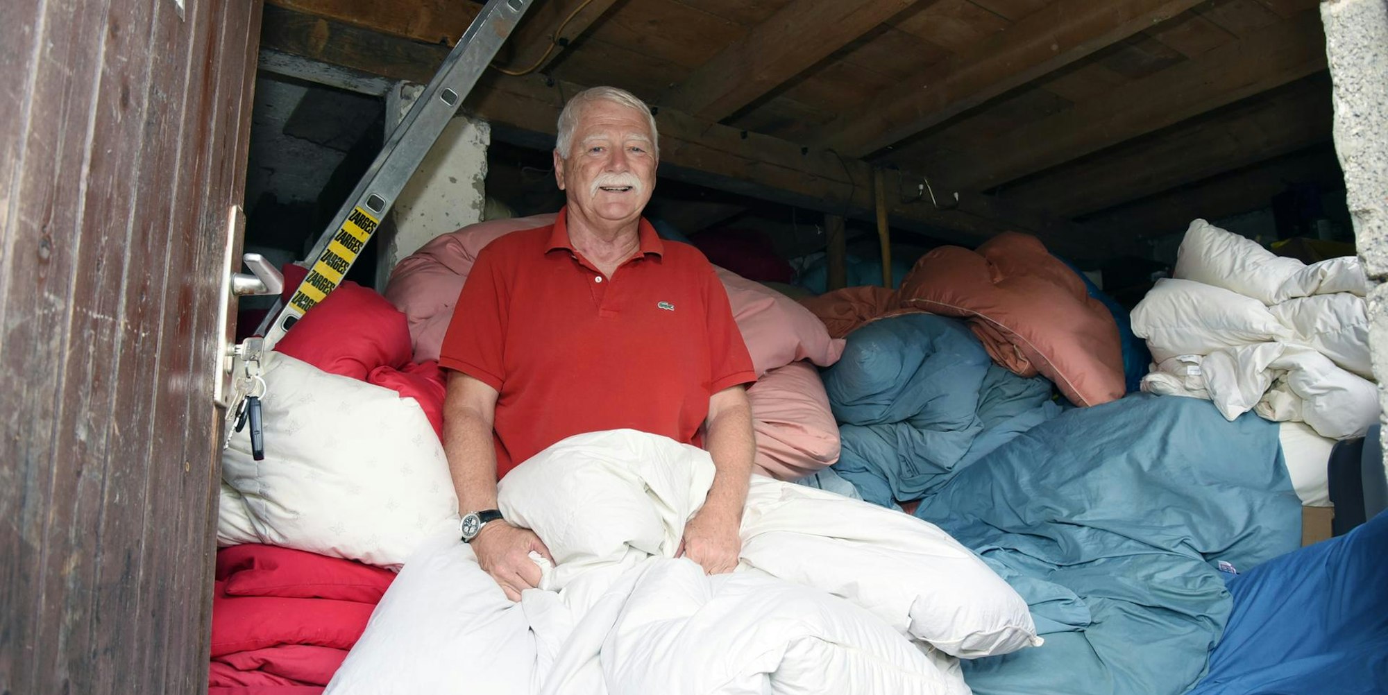 Herr Holle sorgt für Geldregen: Jürgen Brüning sammelt die Federbetten in seiner Scheune, bis er eine Tonne zusammen hat.